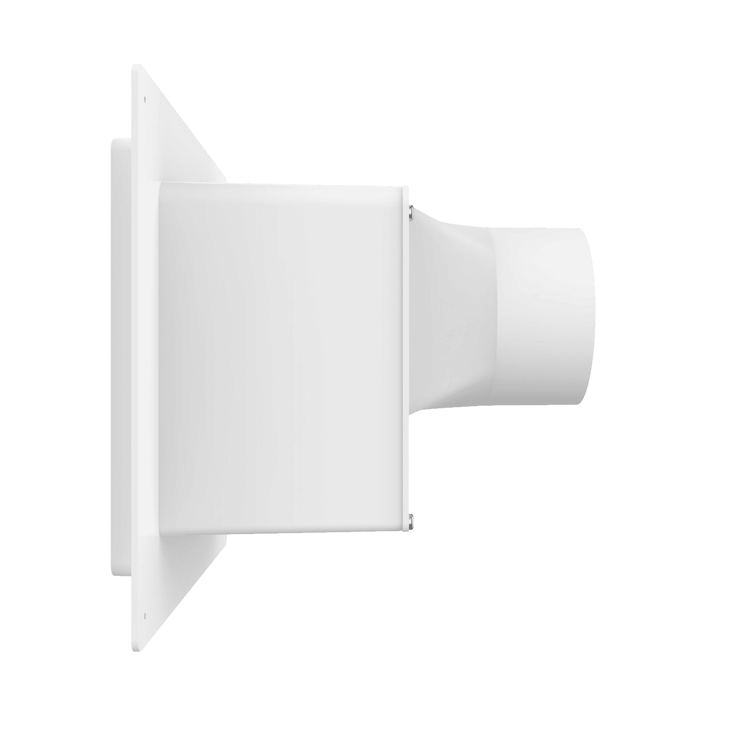 4″ single exhaust box for use with stucco/siding and similar exteriors less than 7/8″ thick. Includes gravity backdraft damper, which can be easily removed to convert box to an intake application. Can be customized to fit unique field conditions.