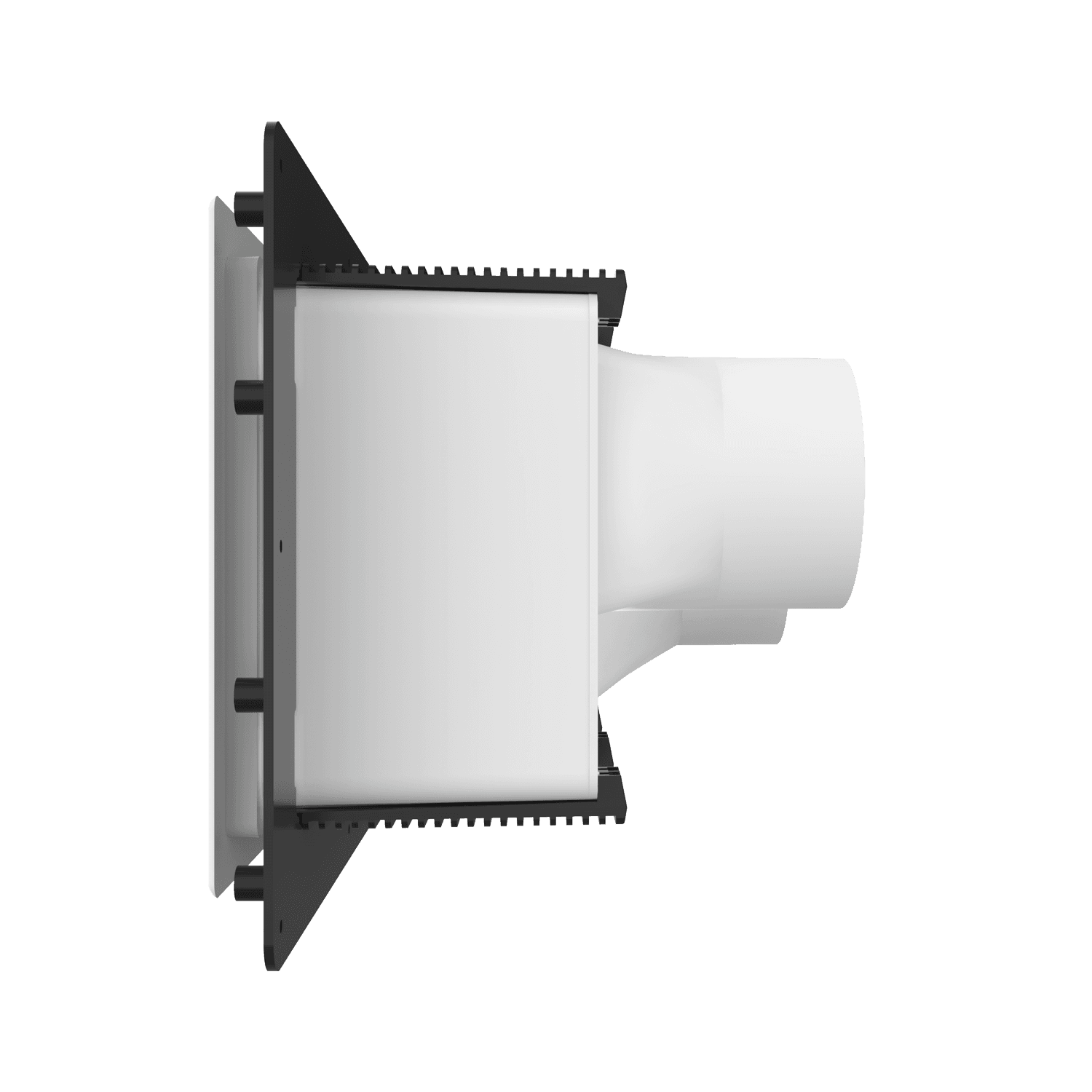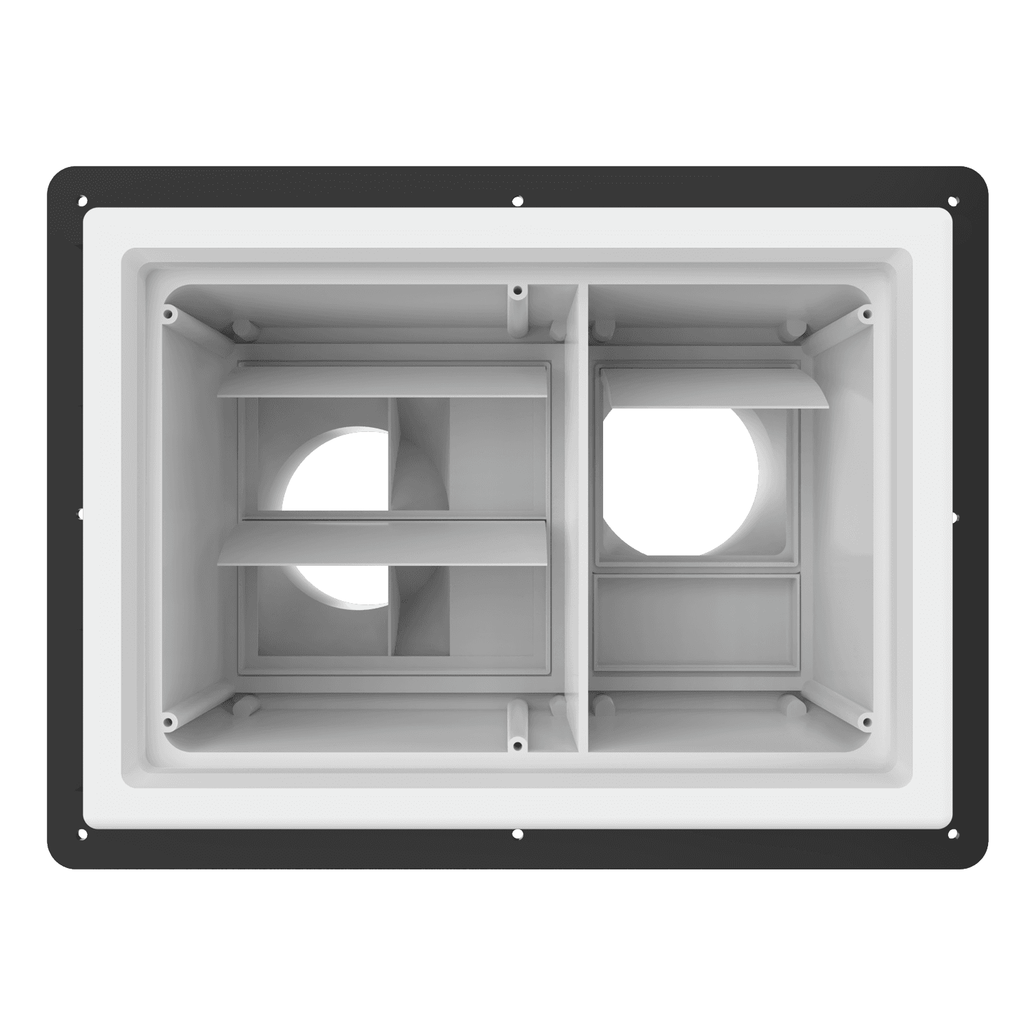 Double exhaust box with dual 4″ duct ports in a horizontal orientation. Features a compression plate mounting flange, ideal for use with glass curtain wall, glazing/composite panel systems and similar exteriors. Includes gravity backdraft dampers and a separator fin which prevents exhaust from mingling inside the box. Can be customized to fit unique field conditions.