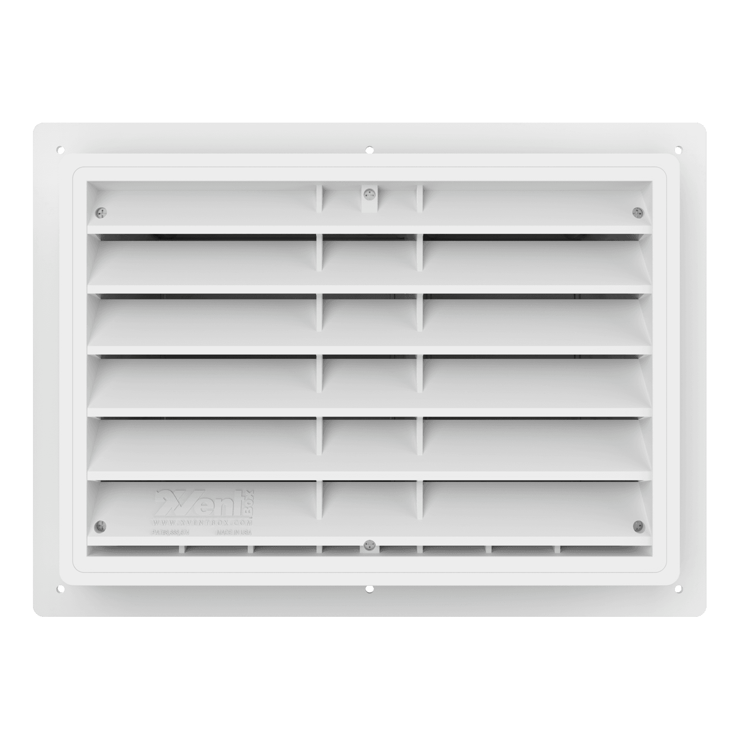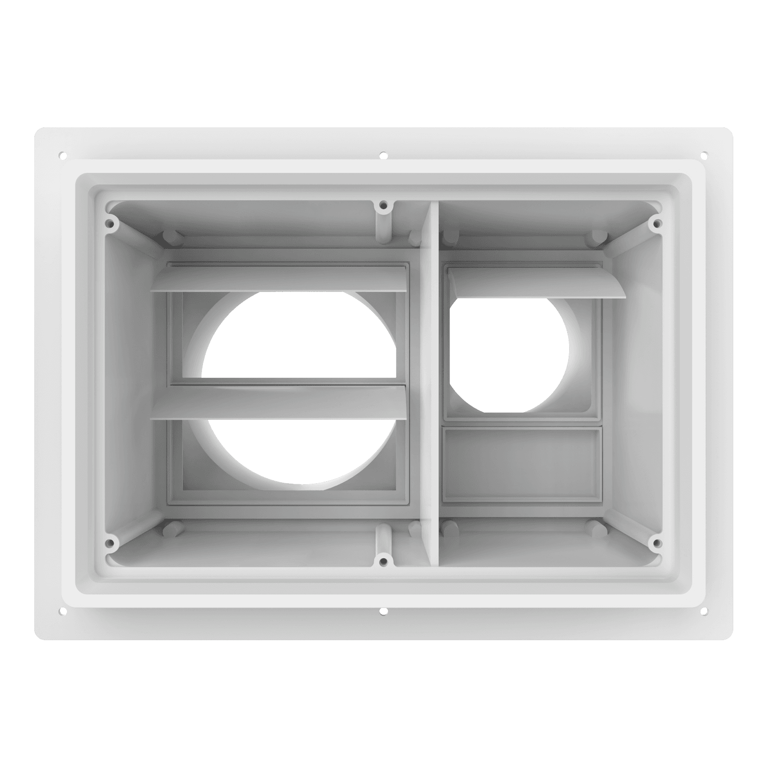 Double exhaust box with 6″ and 4″ duct ports in a horizontal orientation. 4″ port is located on the right side when viewing the box from the front. For use with brick/stone, EIFS, metal panel and stucco/siding greater than 7/8″ thick and similar exteriors. New adjustable mounting sleeve extends offset range from 1″-9″. Includes an improved weather seal, gravity backdraft dampers and a separator fin which prevents exhaust from mingling inside the box. Can be customized to fit unique field conditions.