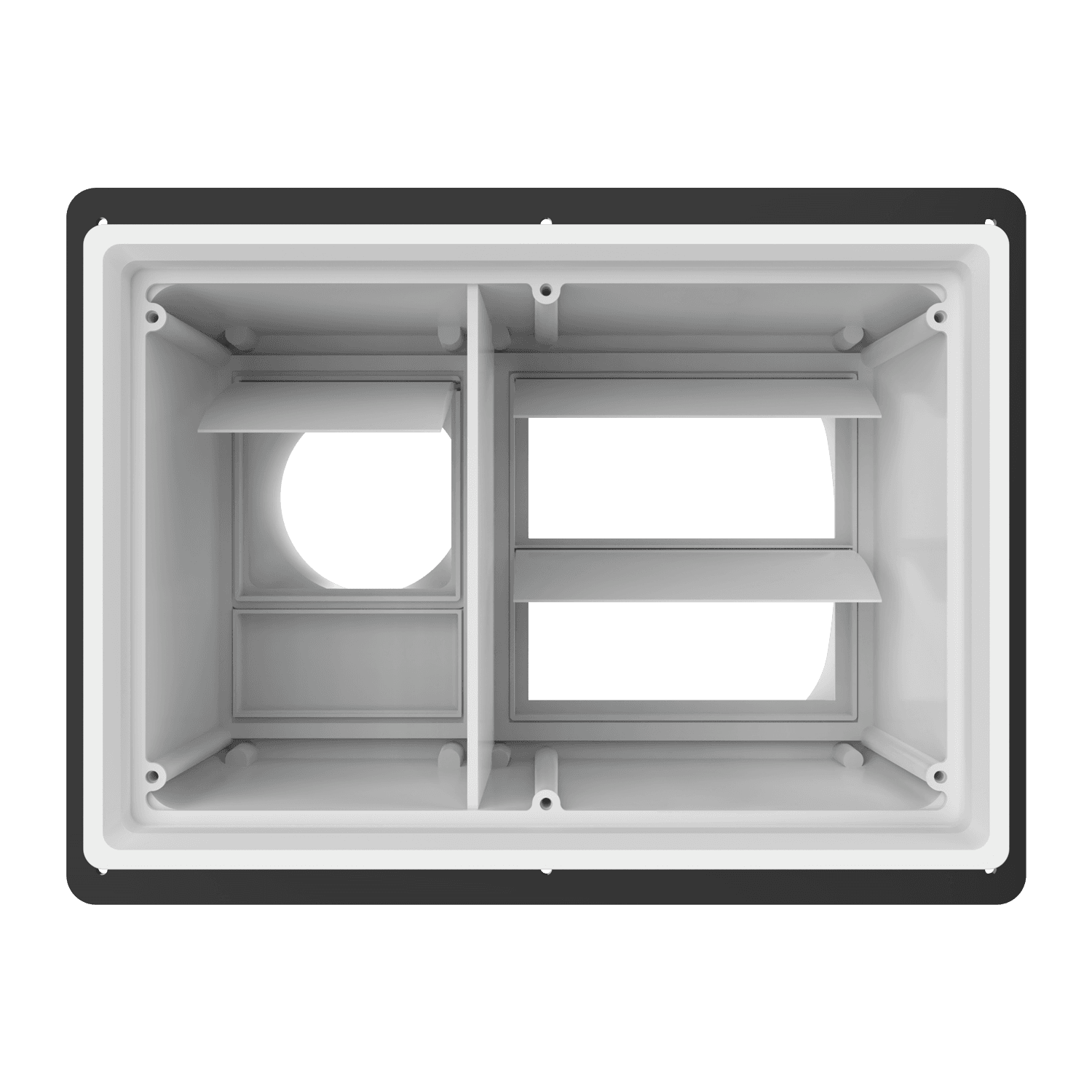 Double exhaust box with 8″ and 4″ duct ports in a horizontal orientation. 4″ port is located on the left side when viewing the box from the front. For use with brick/stone, EIFS, metal panel, stucco/siding greater than 7/8″ thick. Includes adjustable mounting flange with an offset range of 1″- 6″, gravity backdraft dampers and a separator fin which prevents exhaust from mingling inside the box. Can be customized to fit unique field conditions.