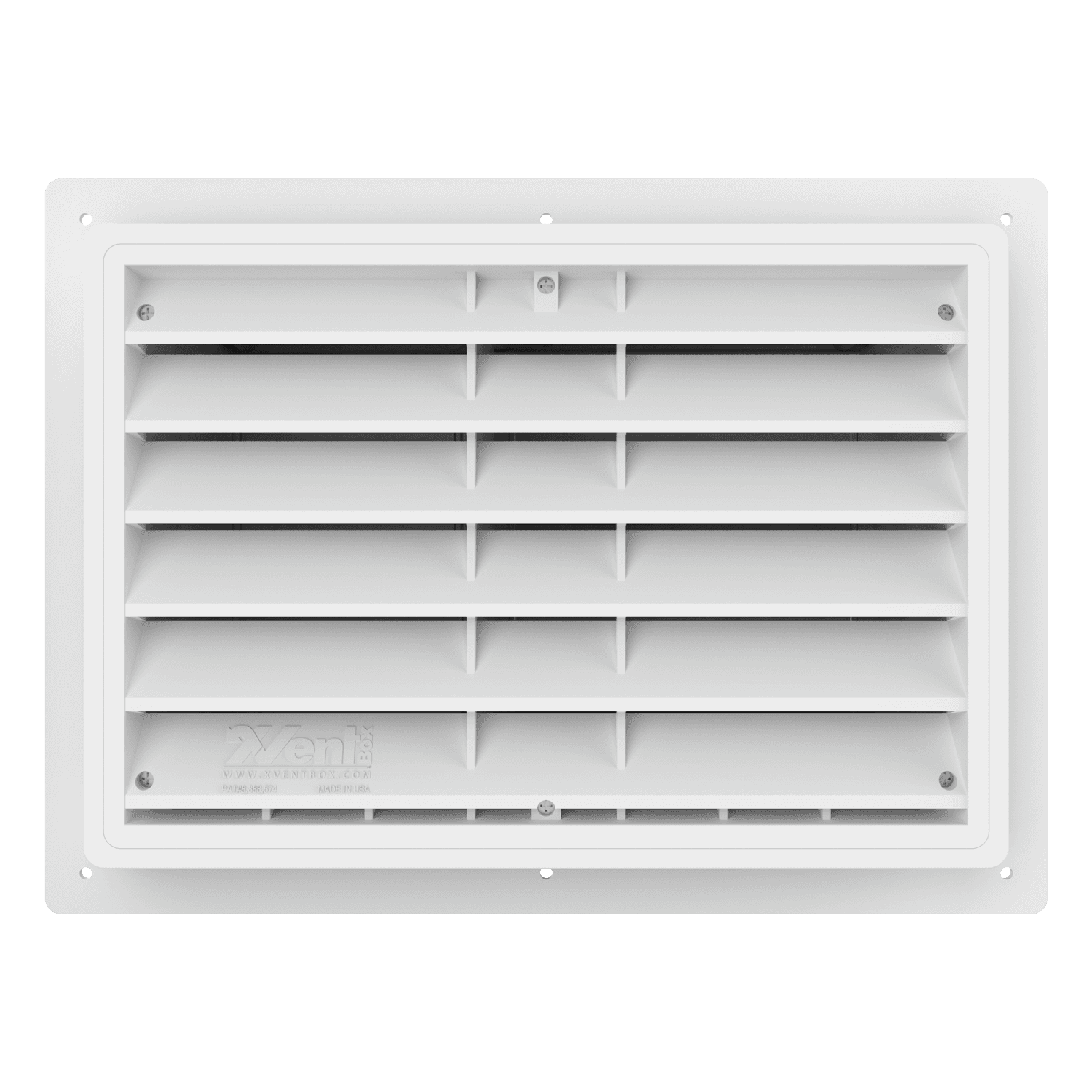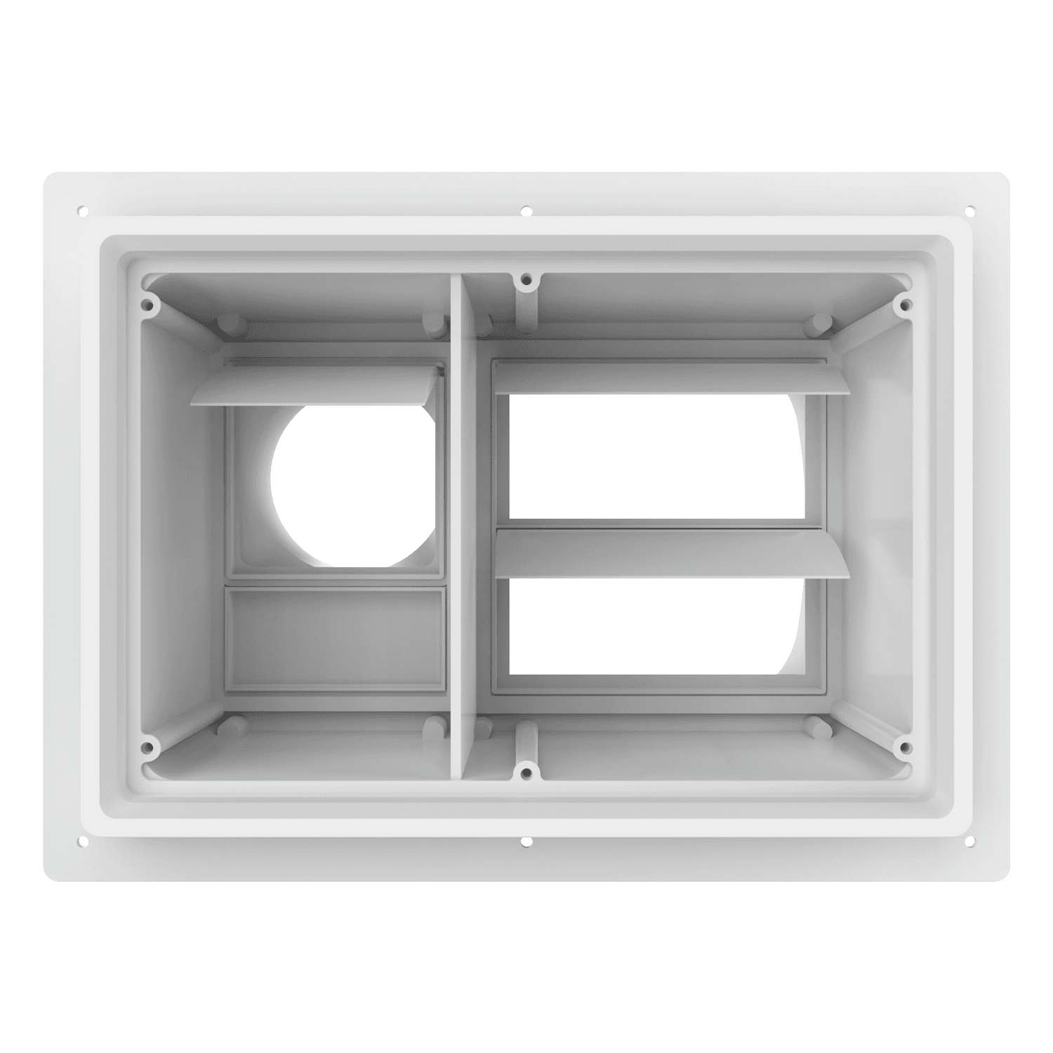 Double exhaust box with 8″ and 4″ duct ports in a horizontal orientation. 4″ port is located on the left side when viewing the box from the front. For use with brick/stone, EIFS, metal panel and stucco/siding greater than 7/8″ thick and similar exteriors. New adjustable mounting sleeve extends offset range from 1″- 9″. Includes an improved weather seal, gravity backdraft dampers and a separator fin which prevents exhaust from mingling inside the box. Can be customized to fit unique field conditions.