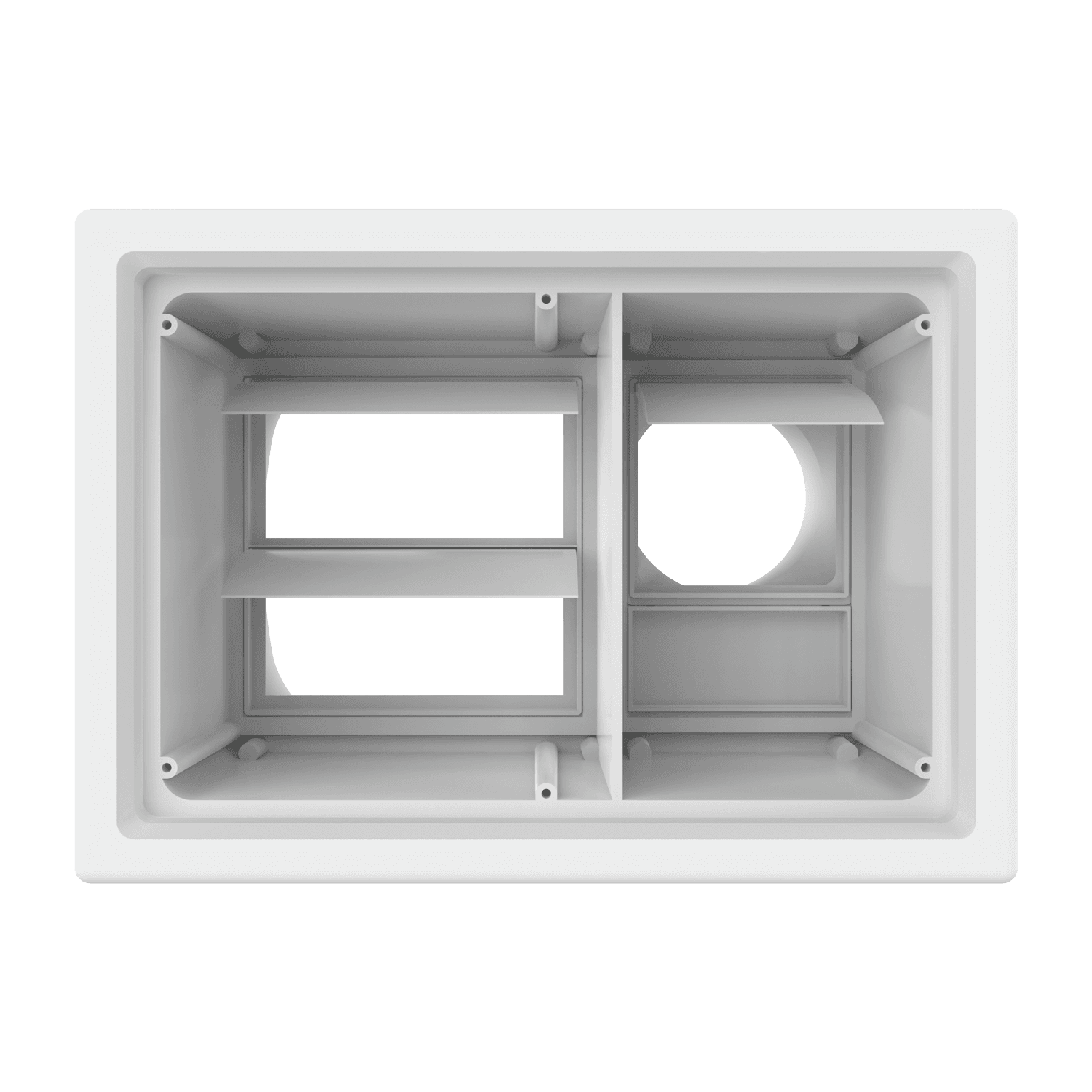 Double exhaust box with 8″ and 4″ duct ports in a horizontal orientation. 4″ port is located on the right side when viewing the box from the front. For use with precast concrete, aluminum panel and similar exteriors. Includes gravity backdraft dampers, mounting straps and a separator fin which prevents exhaust from mingling inside the box. Can be customized to fit unique field conditions.