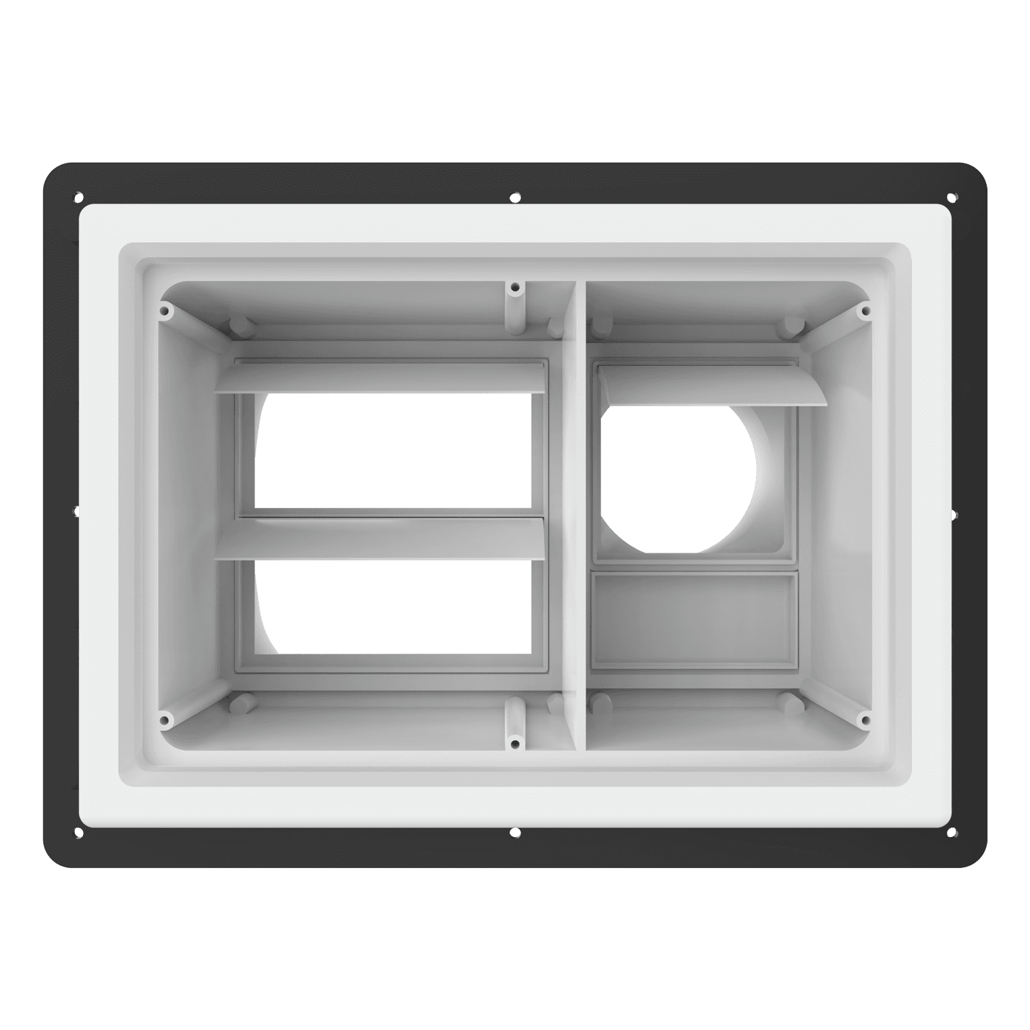 Double exhaust box with 8″ and 4″ duct ports in a horizontal orientation. 4″ port is located on the right side when viewing the box from the front. For use with glass curtain wall, glazing/composite panel systems and similar exteriors. Includes compression plate mounting flange, gravity backdraft dampers and a separator fin which prevents exhaust from mingling inside the box. Can be customized to fit unique field conditions.