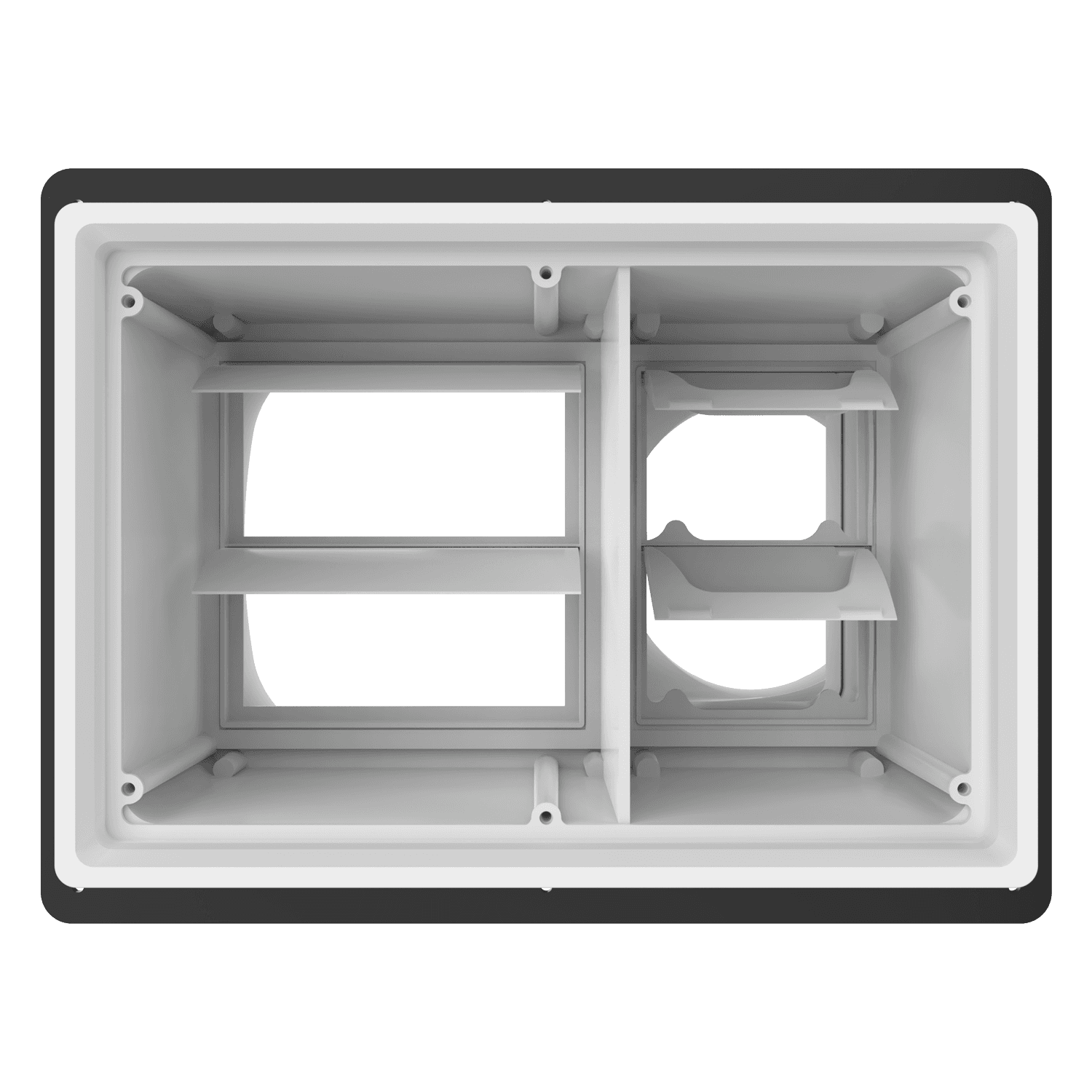 Double exhaust box with 8″ and 6″ duct ports in a horizontal orientation. 6″ port is located on the right side when viewing the box from the front. For use with brick/stone, EIFS, metal panel, stucco/siding greater than 7/8″ thick and similar exteriors. Includes adjustable mounting flange with an offset range of 1″-6″, gravity backdraft dampers and a separator fin which prevents exhaust from mingling inside the box. Can be customized to fit unique field conditions.