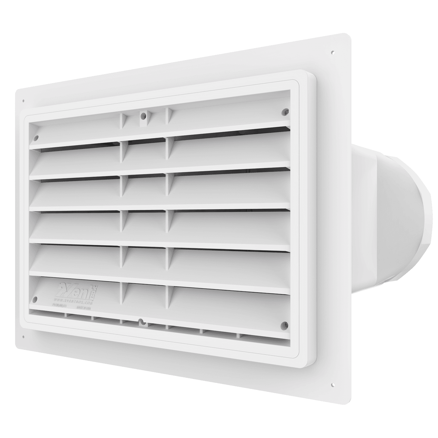 Double exhaust box with 8″ and 6″ duct ports in a horizontal orientation. 6″ port is located on the right side when viewing the box from the front. For use with stucco/siding and similar exteriors less than 7/8″ thick. Includes gravity backdraft dampers and a separator fin which prevents exhaust from mingling inside the box. Can be customized to fit unique field conditions.