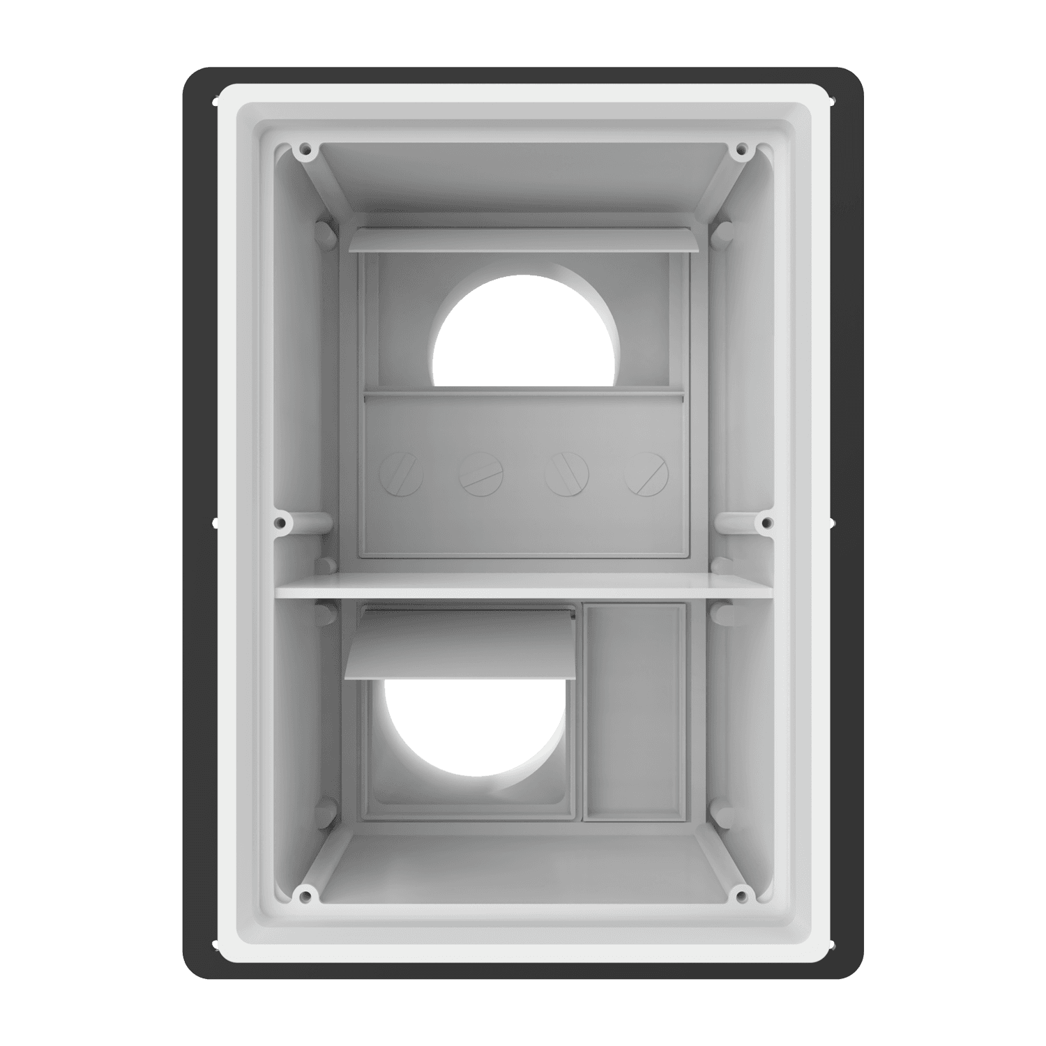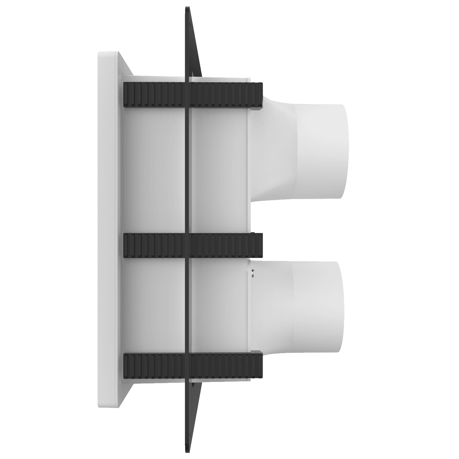 Double exhaust box with dual 4″ duct ports in a vertical orientation. For use with brick/stone, EIFS, metal panel, stucco/siding greater than 7/8″ thick and similar exteriors. Includes adjustable mounting flange with an offset range of 1″-6″, gravity backdraft dampers and a separator fin which prevents exhaust from mingling inside the box. Can be customized to fit unique field conditions.
