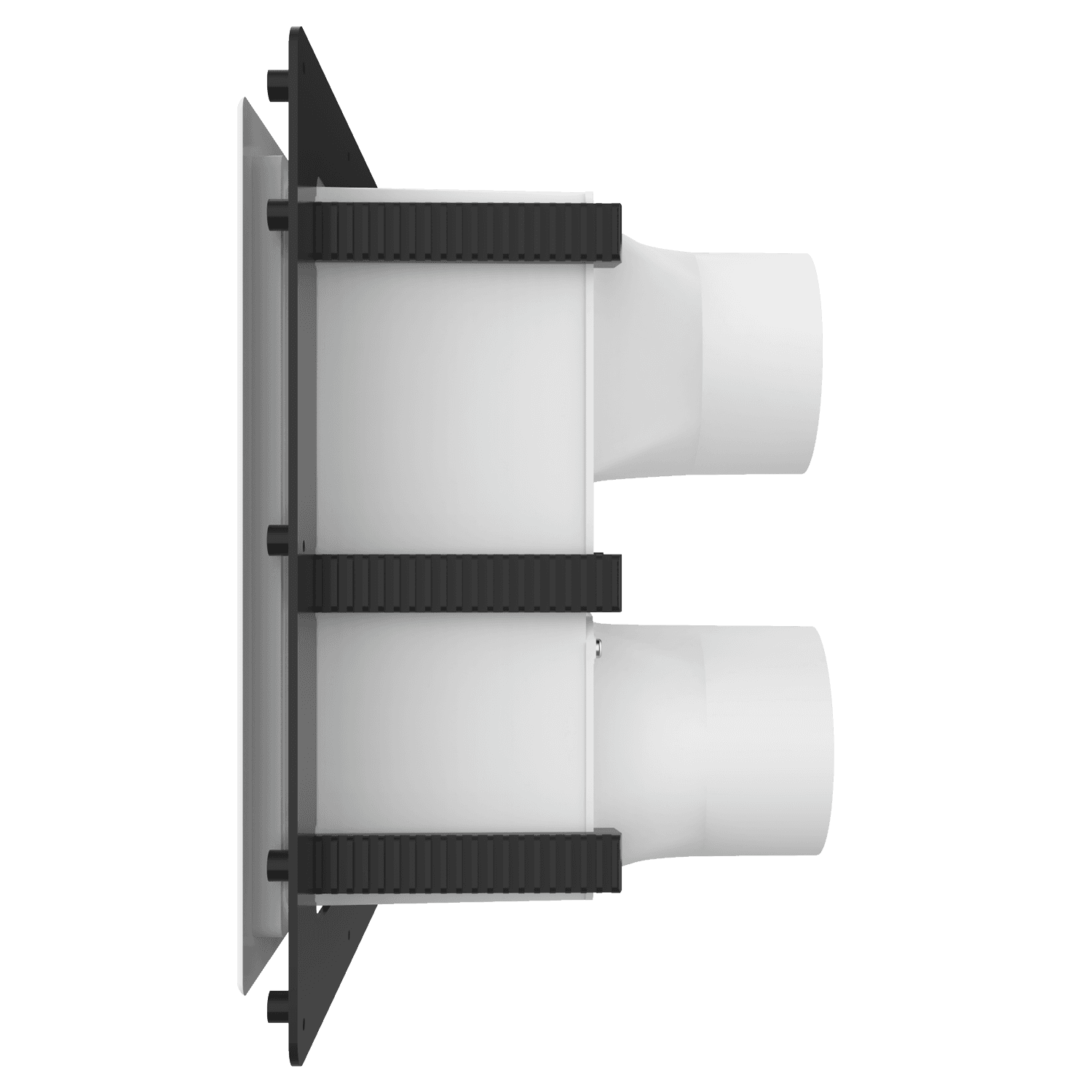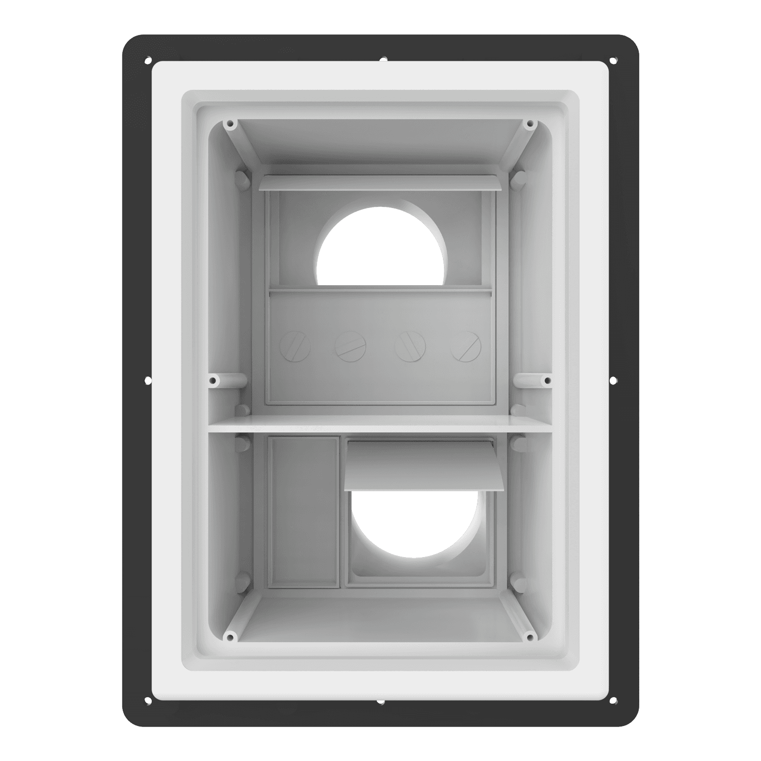 Double exhaust box with dual 4″ duct ports in a vertical orientation. For use with glass curtain wall, glazing/composite panel systems and similar exteriors. Includes compression plate mounting flange, gravity backdraft dampers and a separator fin which prevents exhaust from mingling inside the box. Can be customized to fit unique field conditions.