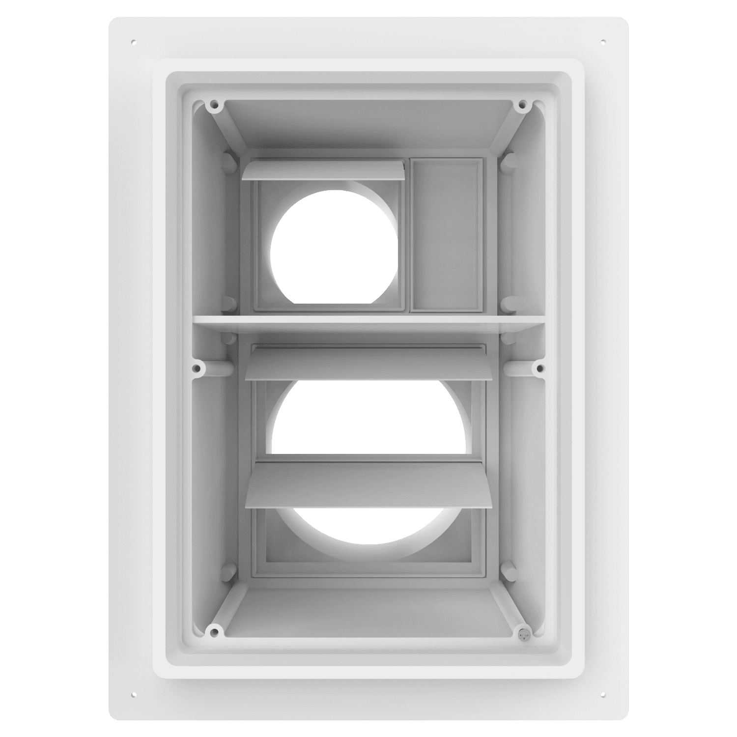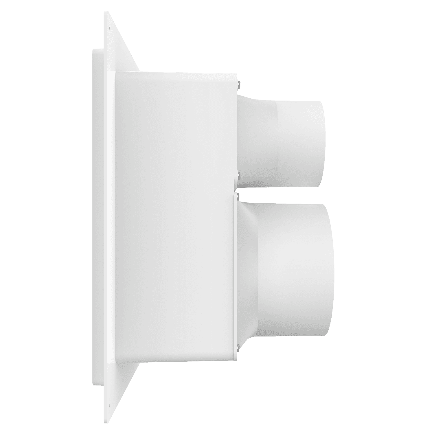 Double exhaust box with 6″ and 4″ duct ports in a vertical orientation. 6″ port is located at the top of the box. For use with stucco/siding and similar exteriors less than 7/8″ thick. Includes gravity backdraft dampers and a separator fin which prevents exhaust from mingling inside the box. Can be customized to fit unique field conditions.
