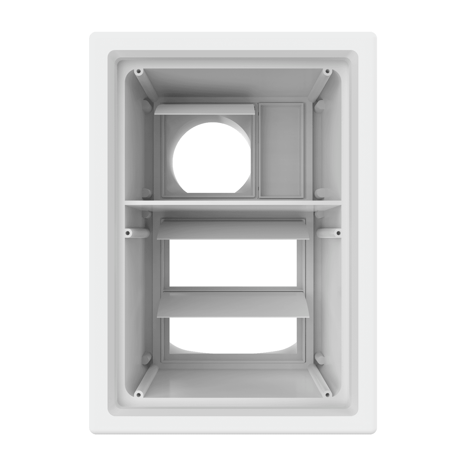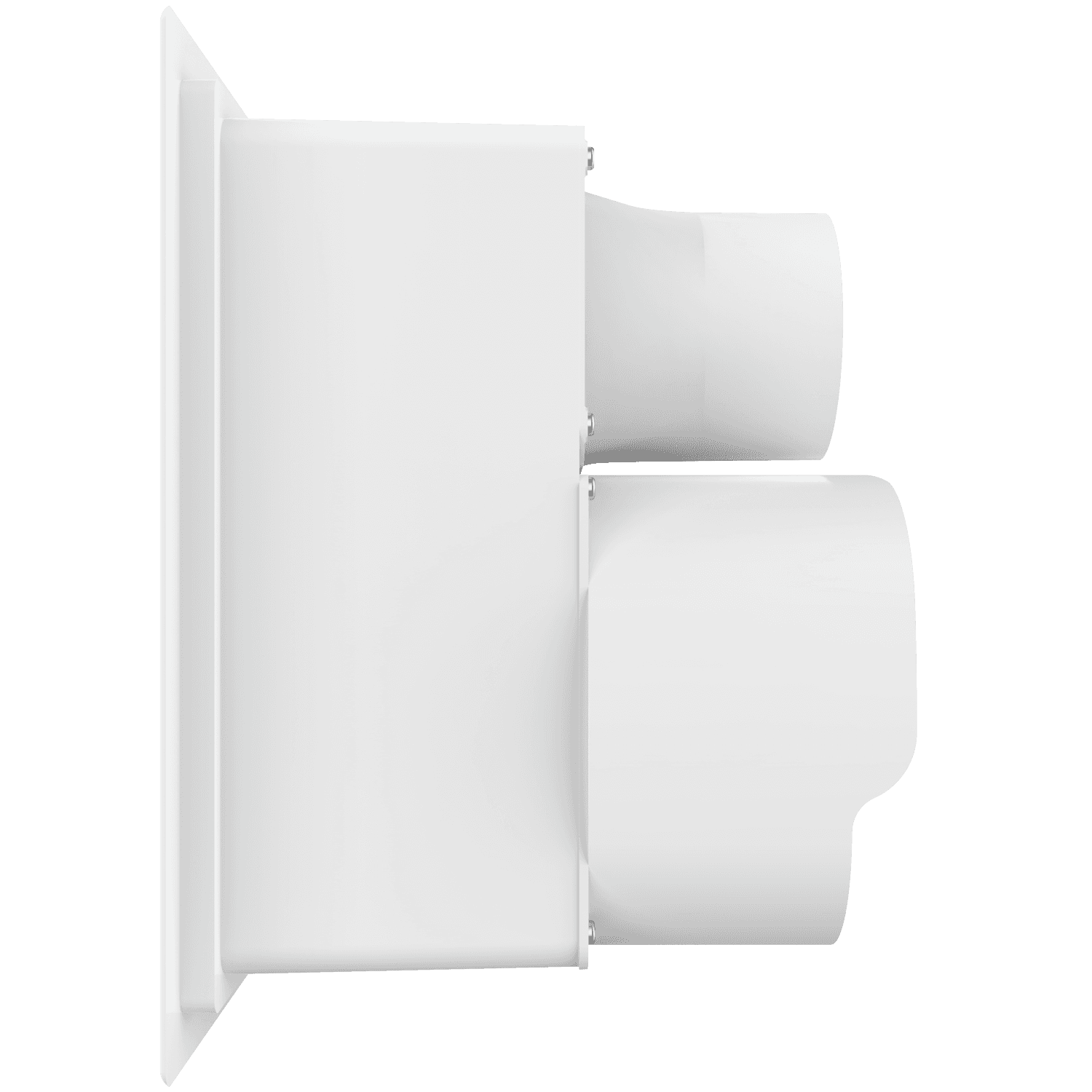 Double exhaust box with 4″ and 8″ duct ports in a vertical orientation. 4″ port is located at the top of the box. For use with precast concrete, aluminum panel and similar exteriors. Includes gravity backdraft dampers, mounting straps and a separator fin which prevents exhaust from mingling inside the box. Can be customized to fit unique field conditions.