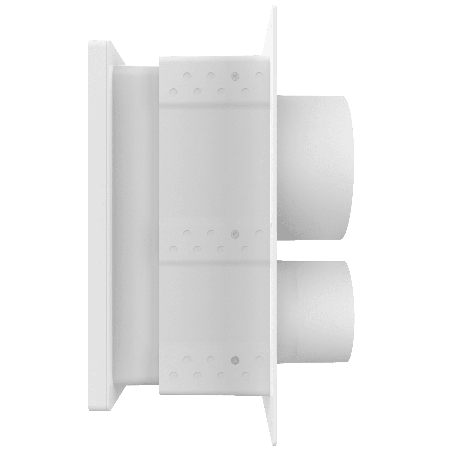 Double exhaust box with 6″ and 4″ duct ports in a vertical orientation. 6″ port is located at the top of the box. For use with brick/stone, EIFS, metal panel and stucco/siding greater than 7/8″ thick and similar exteriors. New adjustable mounting sleeve extends offset range from 1″- 9″. Includes an improved weather seal, gravity backdraft dampers and a separator fin which prevents exhaust from mingling inside the box. Can be customized to fit unique field conditions.