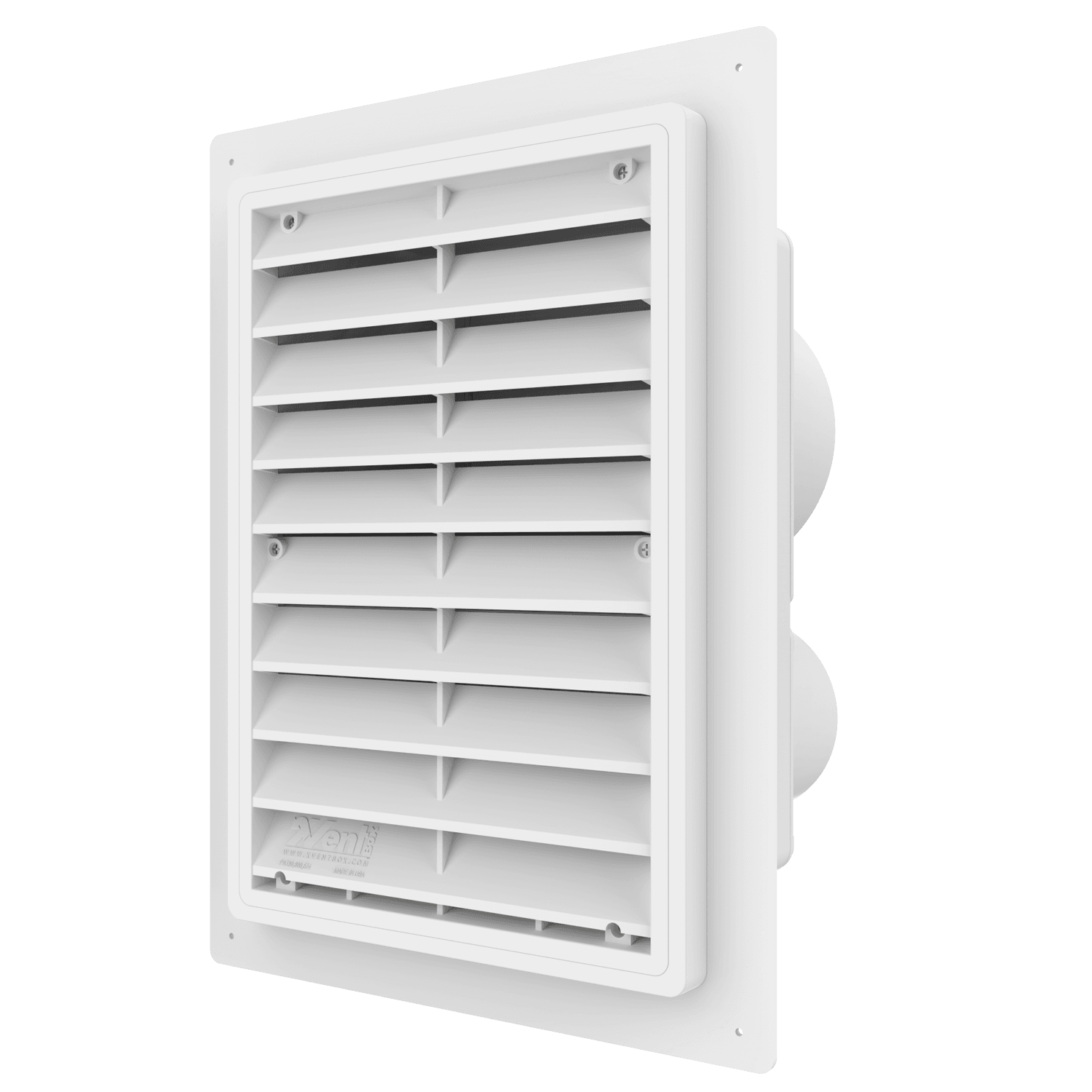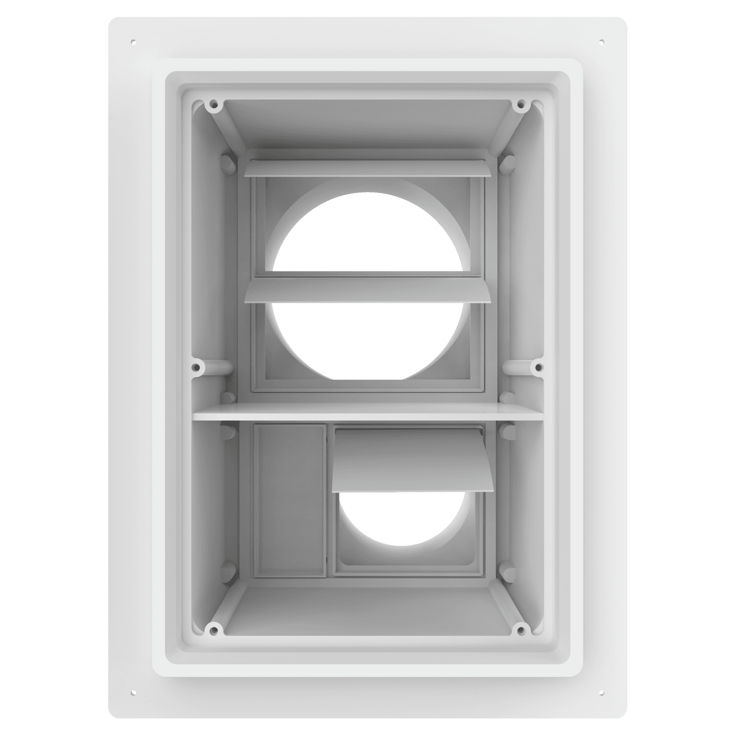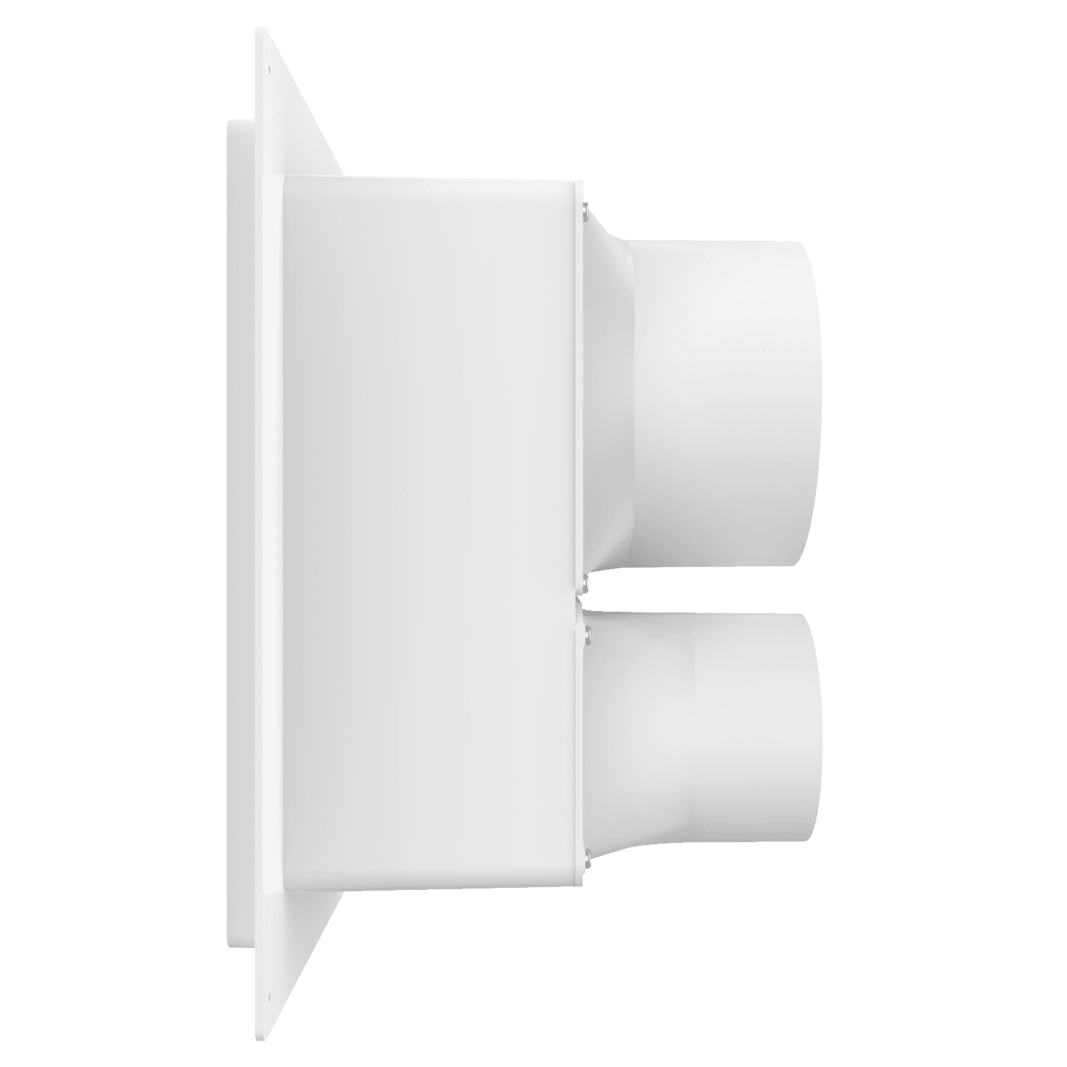 Double exhaust box with 6″ and 4″ duct ports in a vertical orientation. 6″ port is located at the top of the box. For use with stucco/siding and similar exteriors less than 7/8″ thick. Includes gravity backdraft dampers and a separator fin which prevents exhaust from mingling inside the box. Can be customized to fit unique field conditions.