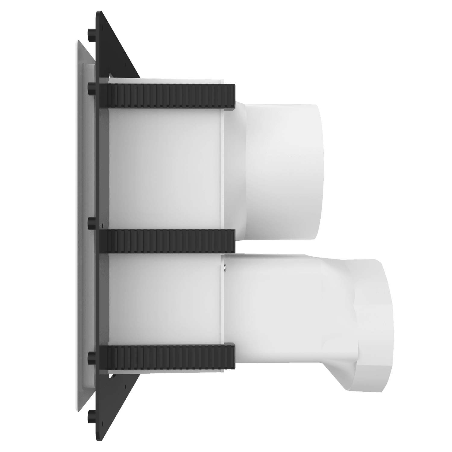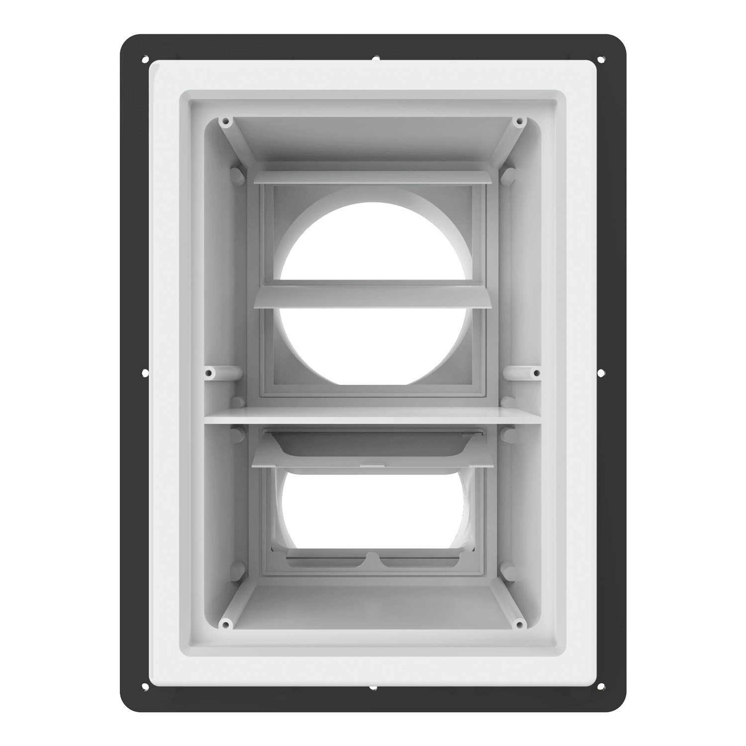 Double exhaust box with dual 6″ duct ports in a vertical orientation. For use with glass curtain wall, glazing/composite panel systems and similar exteriors. Includes compression plate mounting flange, gravity backdraft dampers and a separator fin which prevents exhaust from mingling inside the box. Can be customized to fit unique field conditions.