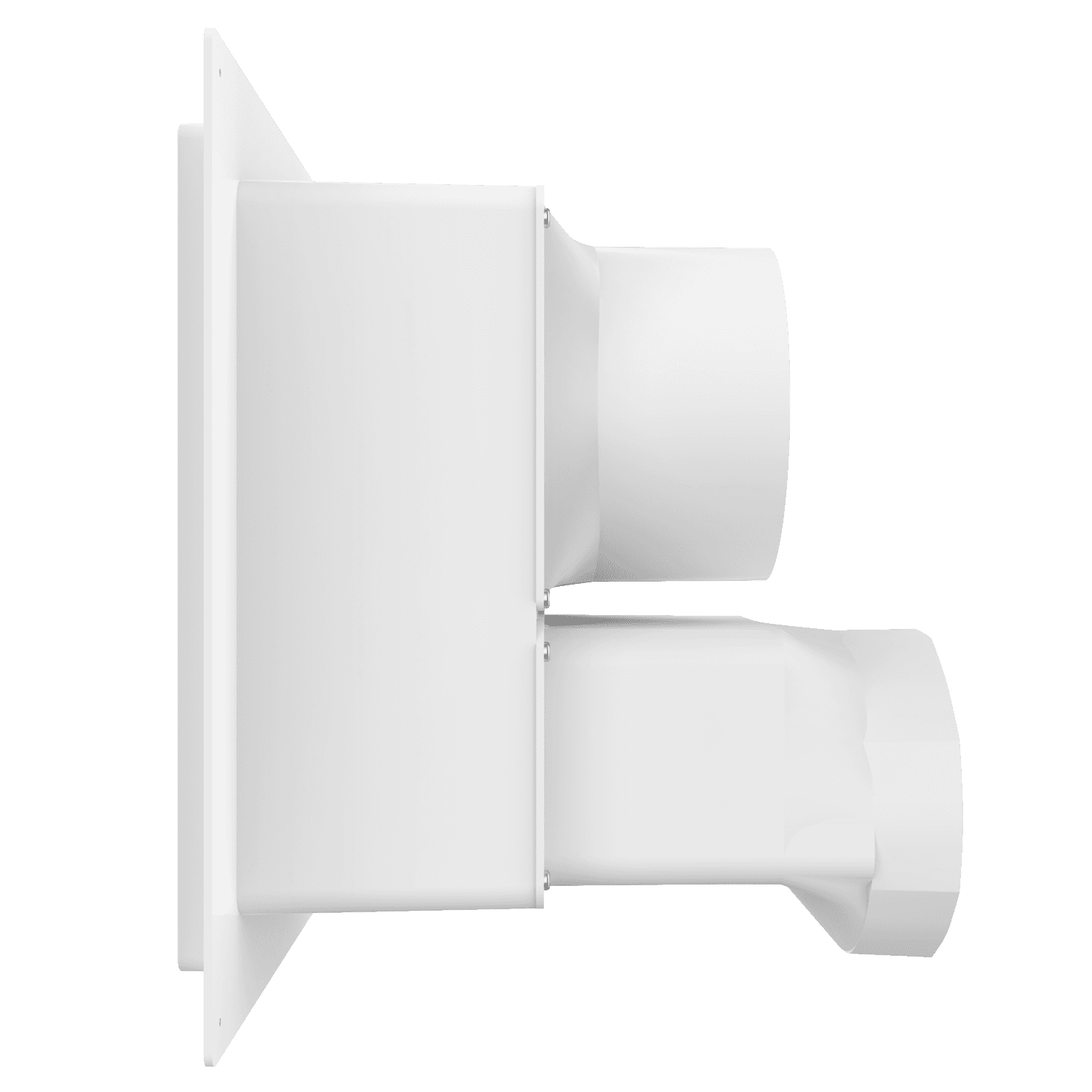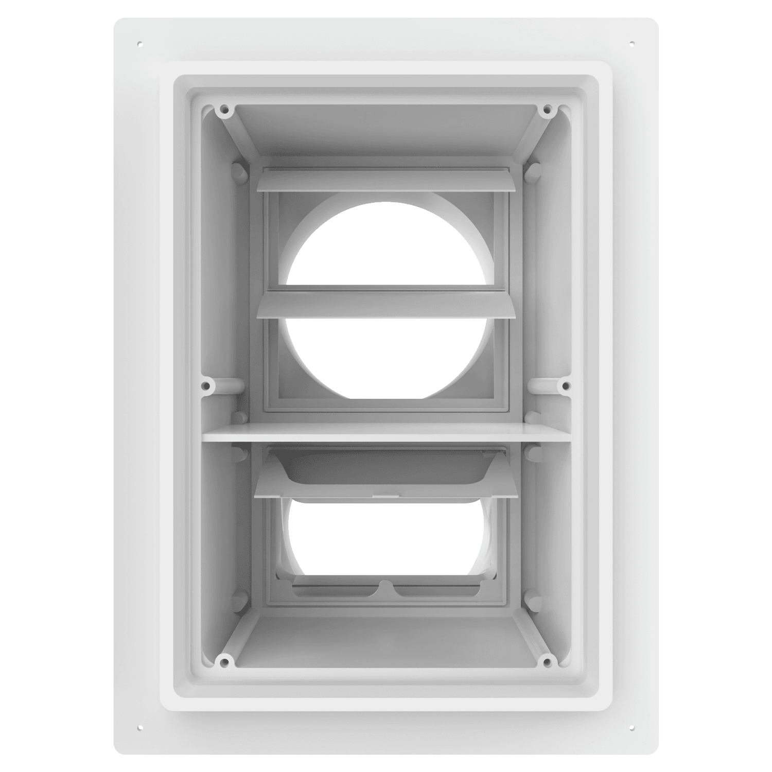 Double exhaust box with dual 6″ duct ports in a vertical orientation. For use with stucco/siding and similar exteriors less than 7/8″ thick. Includes gravity backdraft dampers and a separator fin which prevents exhaust from mingling inside the box. Can be customized to fit unique field conditions.