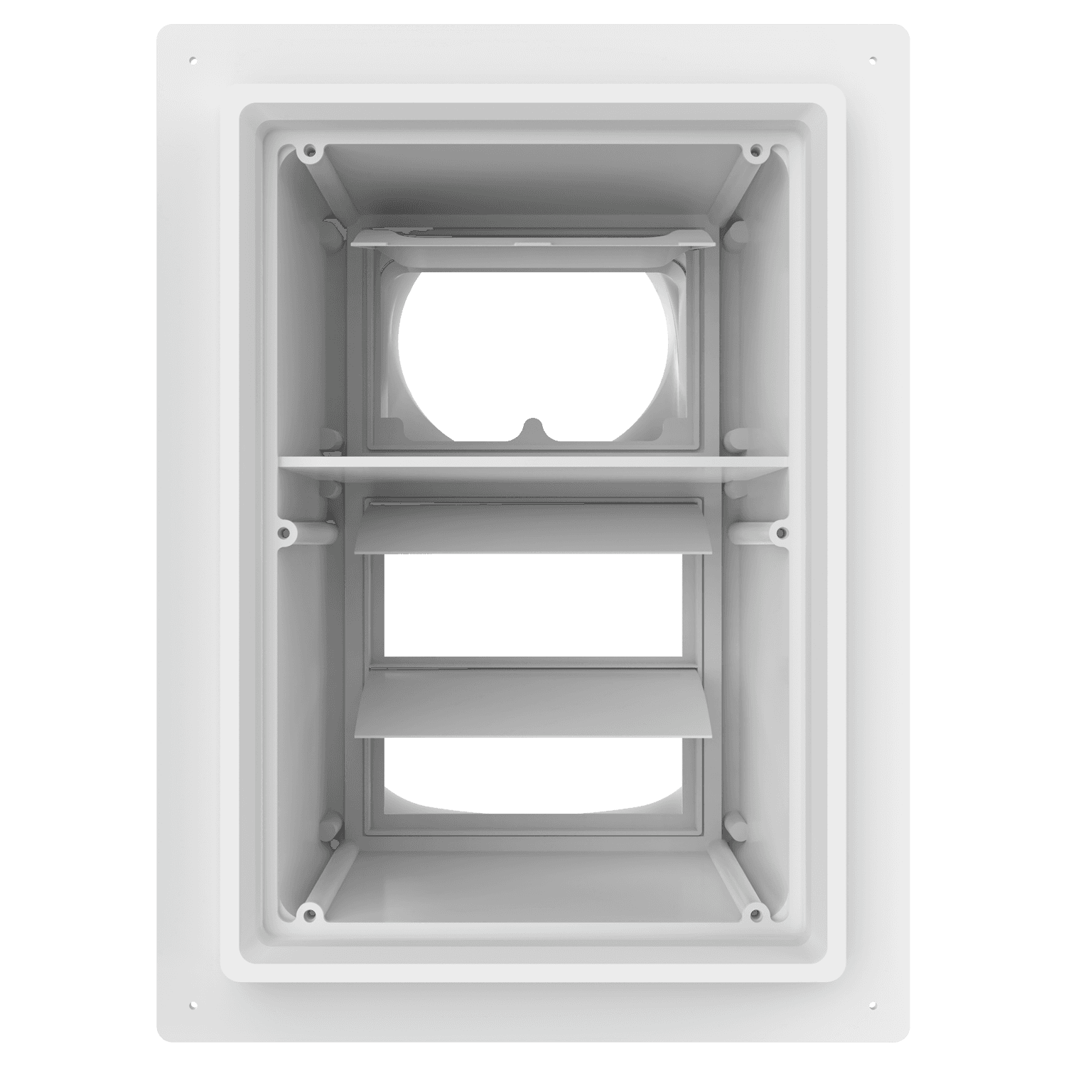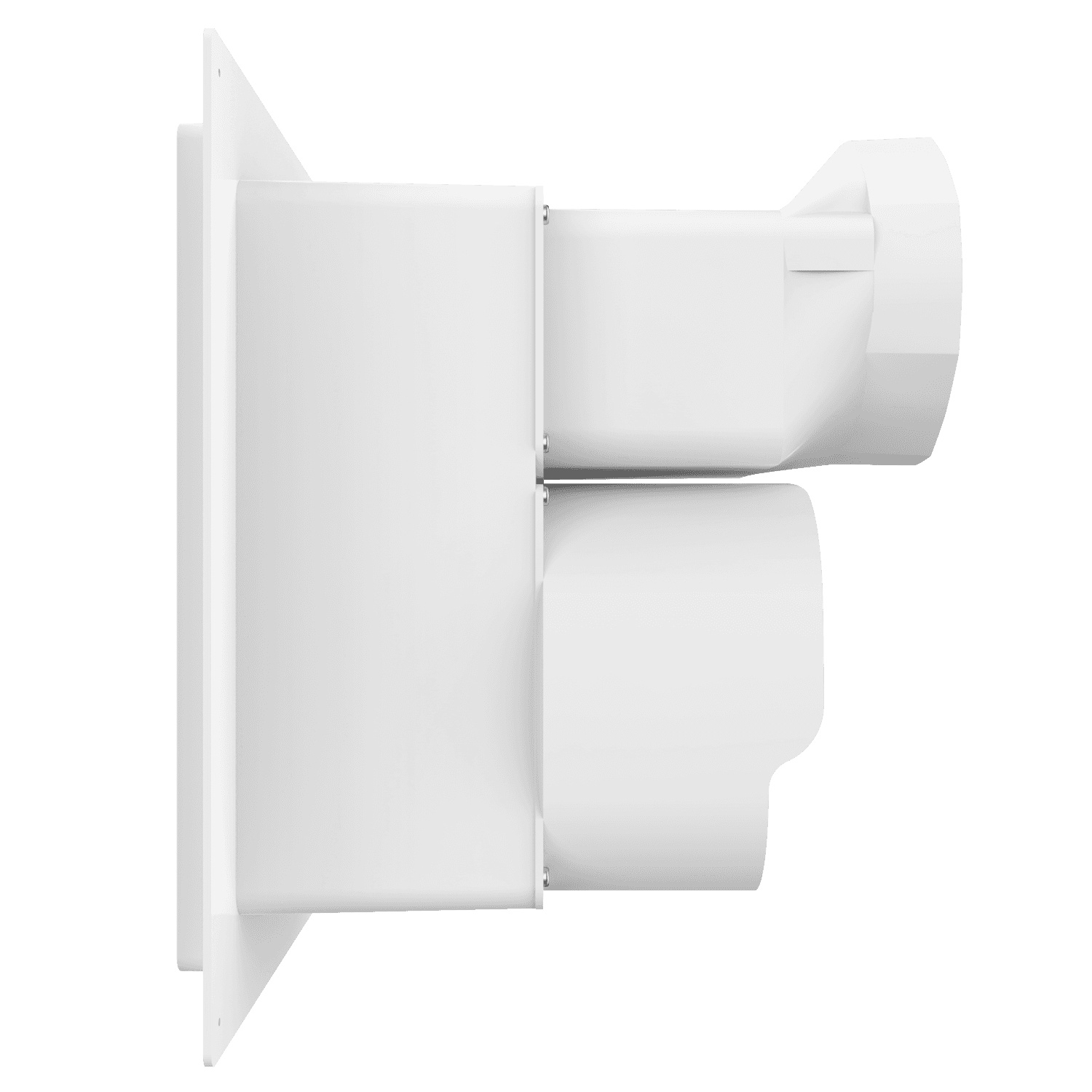 Double exhaust box with 6″ and 8″ duct ports in a vertical orientation. 6″ port is located at the top of the box. For use with stucco/siding and similar exteriors less than 7/8″ thick. Includes gravity backdraft dampers and a separator fin which prevents exhaust from mingling inside the box. Can be customized to fit unique field conditions.