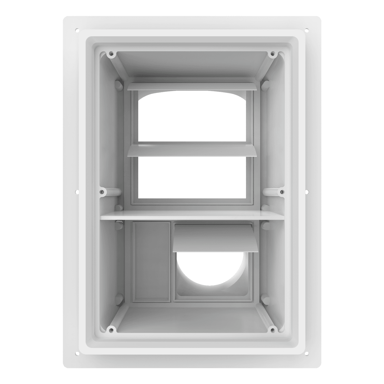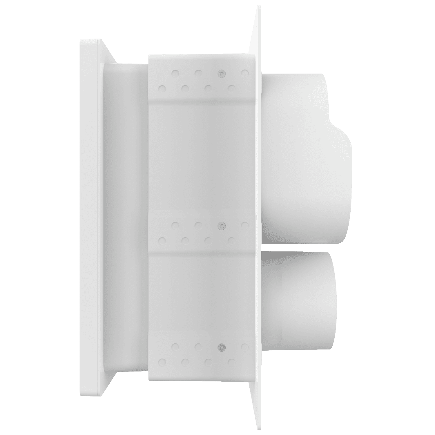 Double exhaust box with 8″ and 4″ duct ports in a horizontal orientation. 4″ port is located on the left side when viewing the box from the front. For use with brick/stone, EIFS, metal panel and stucco/siding greater than 7/8″ thick and similar exteriors. New adjustable mounting sleeve extends offset range from 1″- 9″. Includes an improved weather seal, gravity backdraft dampers and a separator fin which prevents exhaust from mingling inside the box. Can be customized to fit unique field conditions.