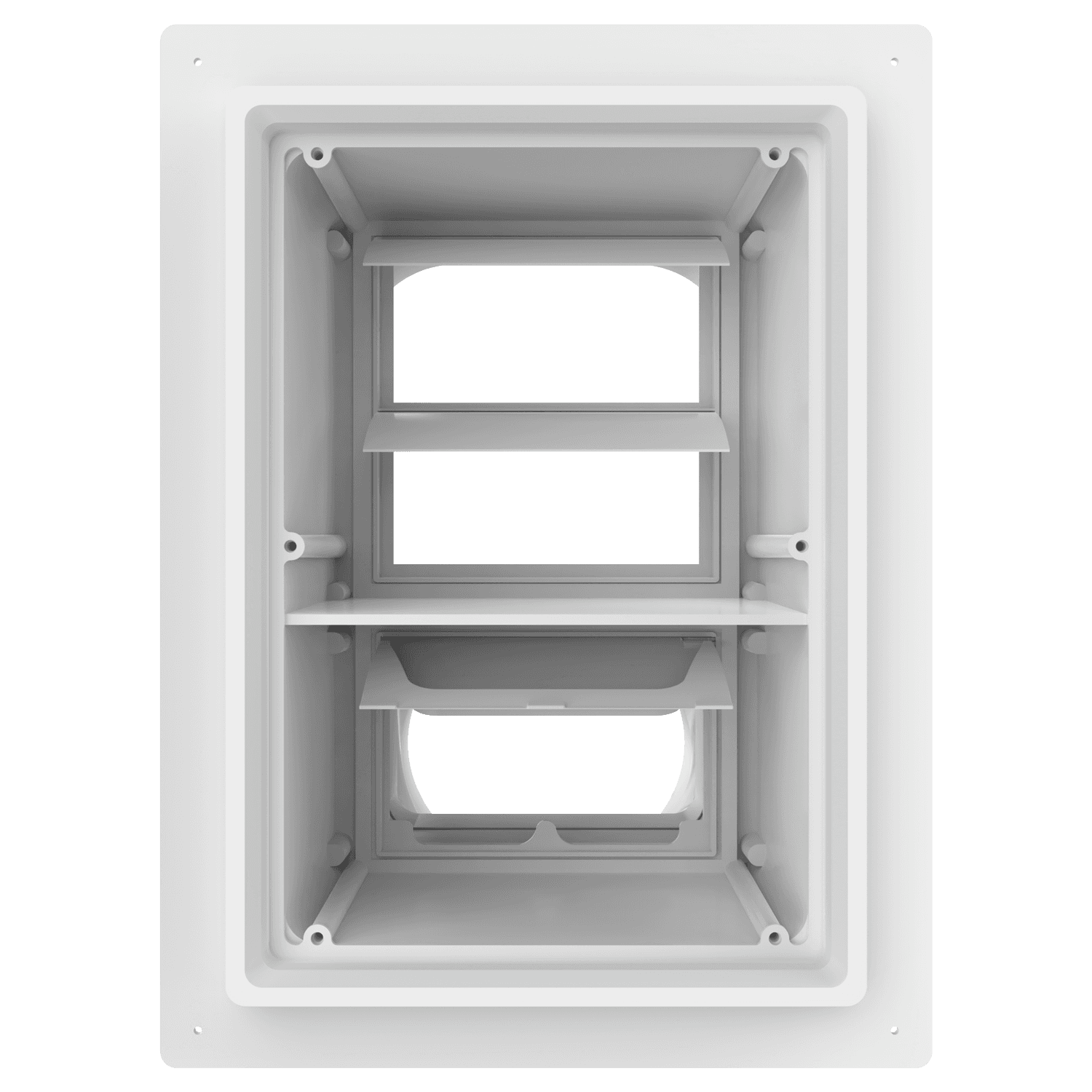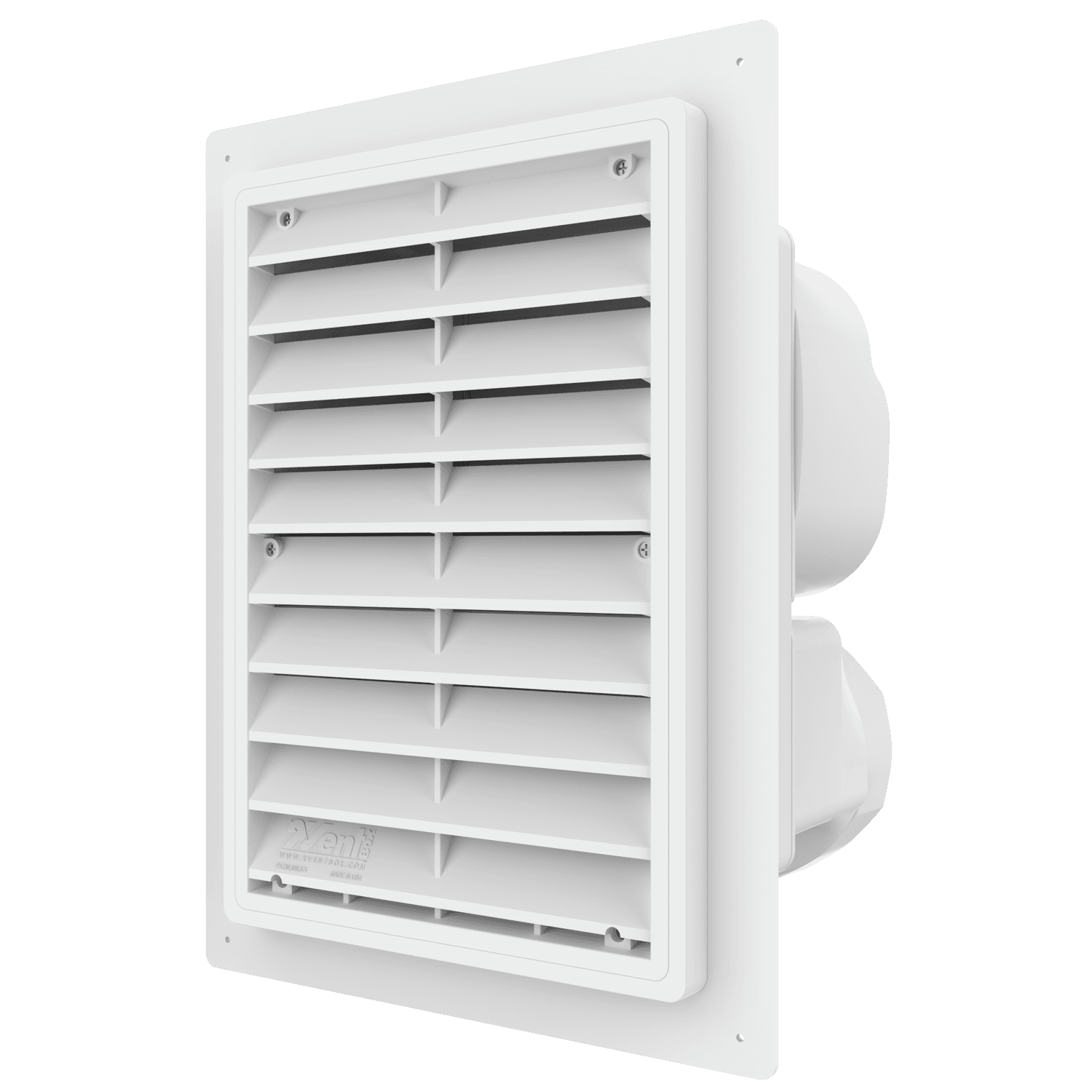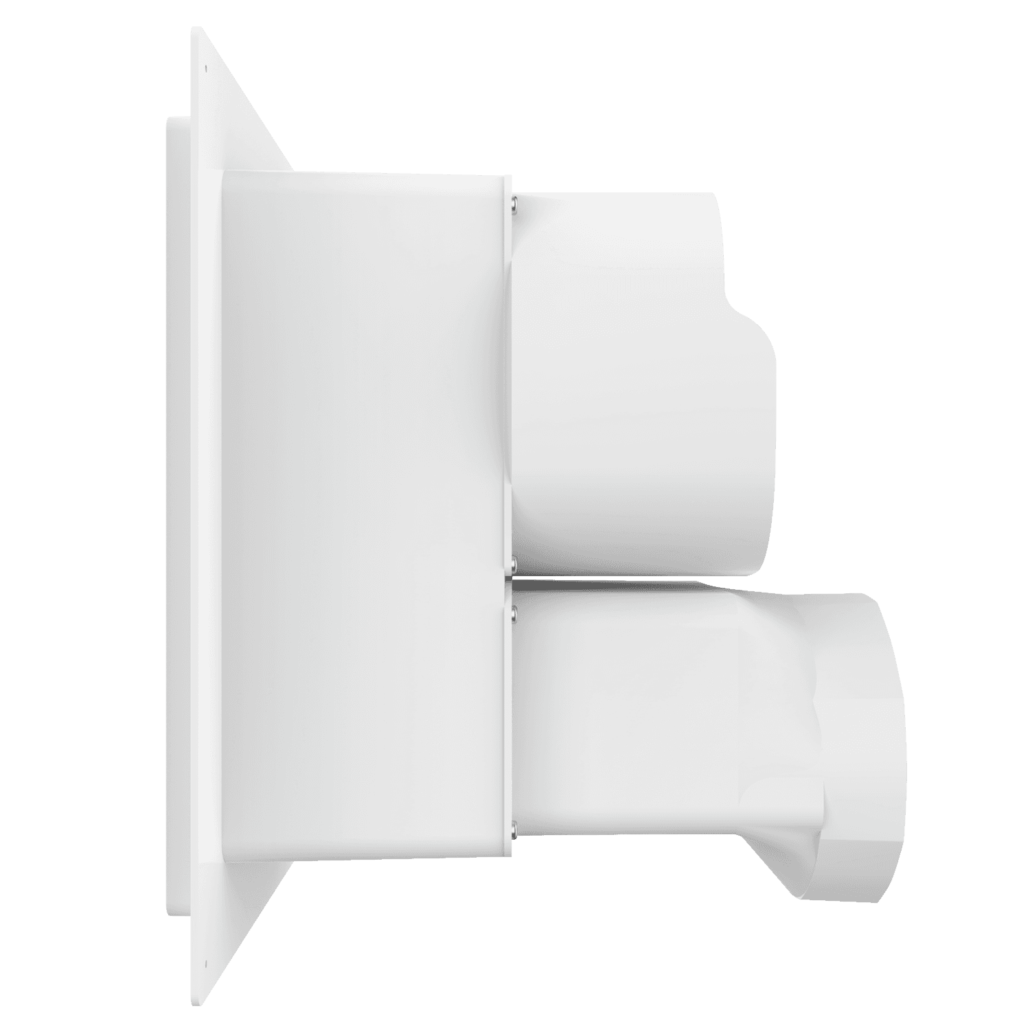 Double exhaust box with 8″ and 6″ duct ports in a vertical orientation. 8″ port is located at the top of the box. For use with stucco/siding and similar exteriors less than 7/8″ thick. Includes gravity backdraft dampers and a separator fin which prevents exhaust from mingling inside the box.