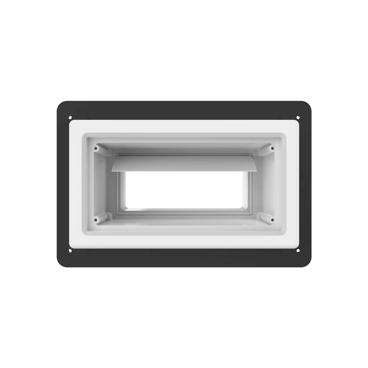 5″ horizontal low profile exhaust box for use with glass curtain wall, glazing/composite panel systems and similar exteriors. Includes gravity backdraft damper and compression plate mounting flange. Can be customized to fit unique field conditions.