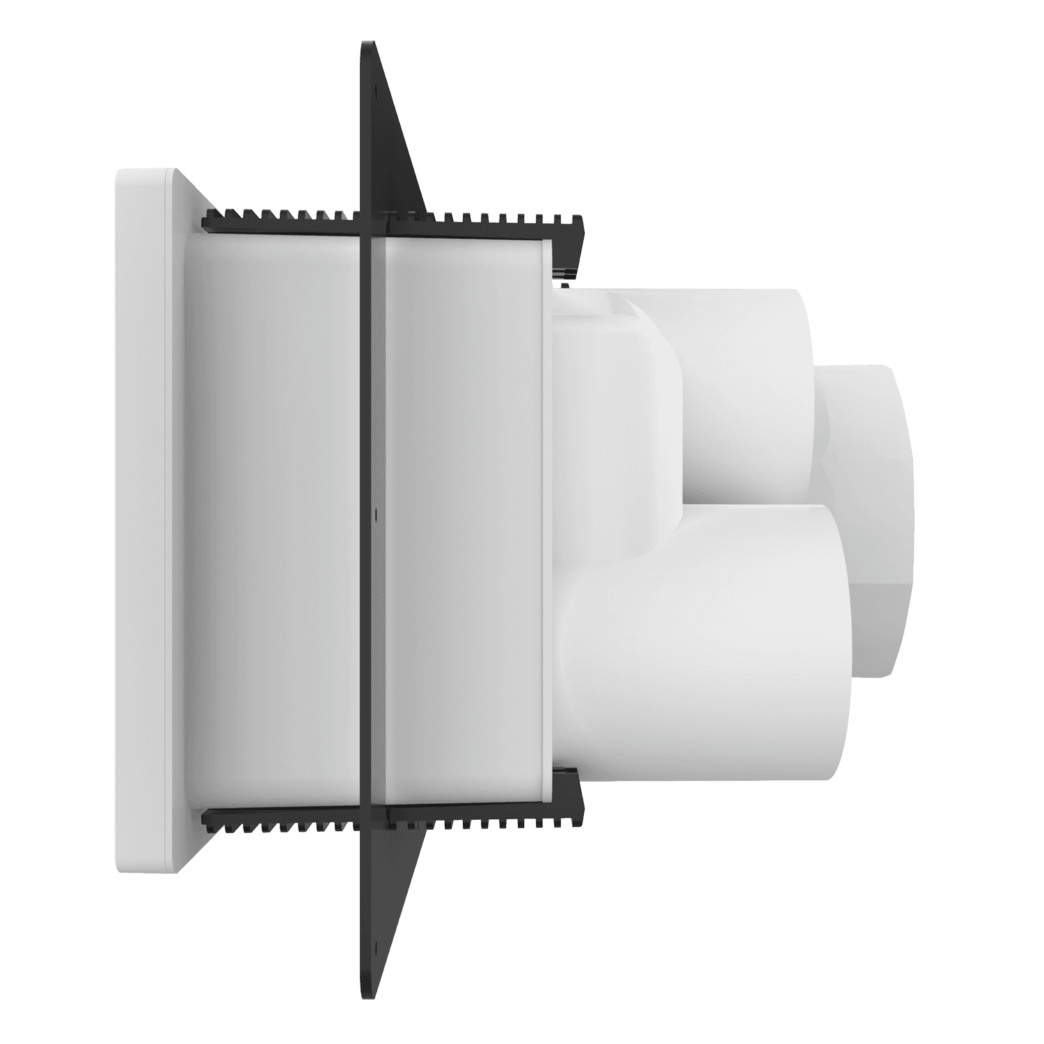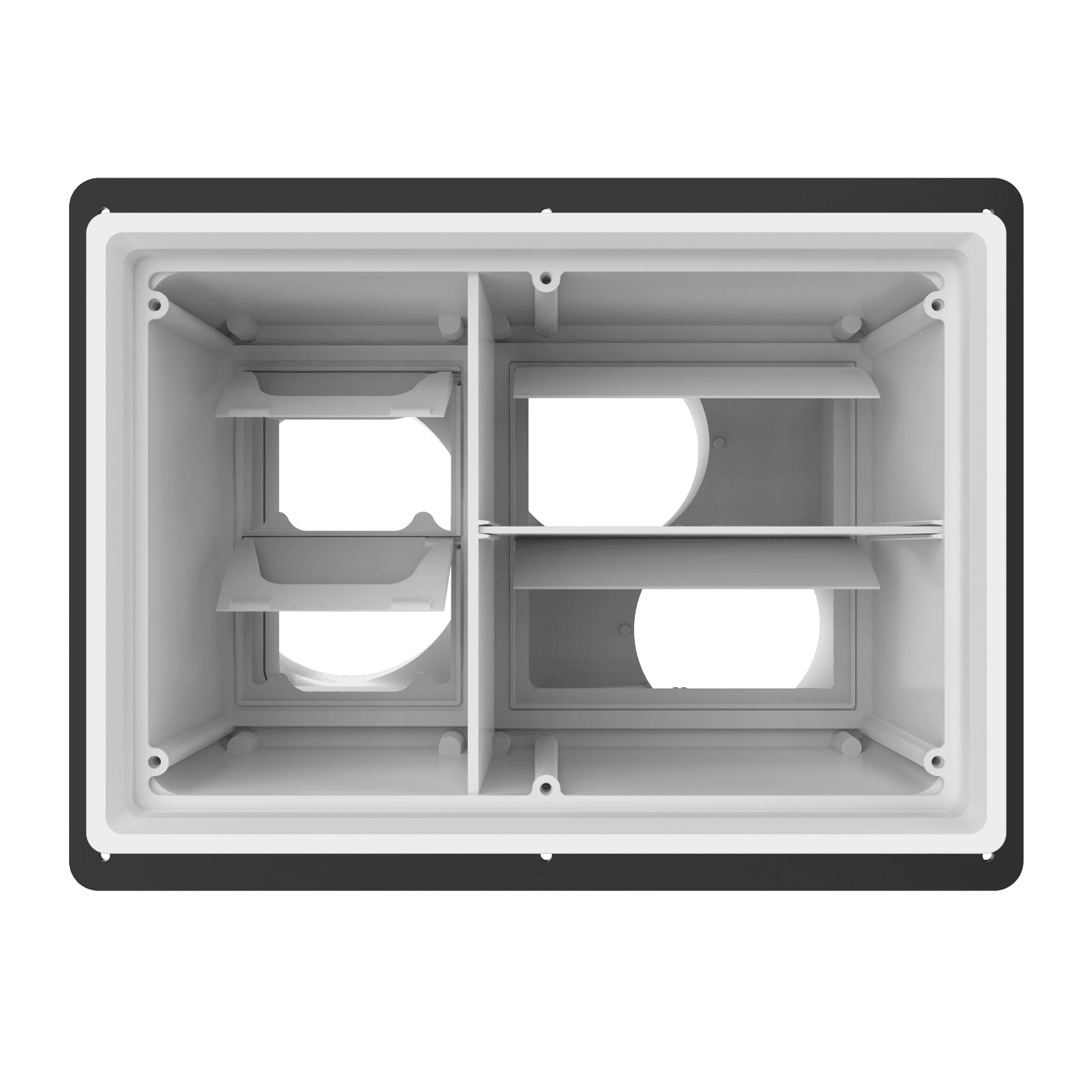 Triple exhaust box with dual 4″ and single 6″ duct ports in a horizontal orientation. 6″ port is located on the left side when viewing the box from the front. For use with brick/stone, EIFS, metal panel, stucco/siding greater than 7/8″ thick and similar exteriors. Includes adjustable mounting flange with an offset range of 1″-6″, gravity backdraft dampers and separator fins which prevent exhaust from mingling inside the box. Can be customized to fit unique field conditions.
