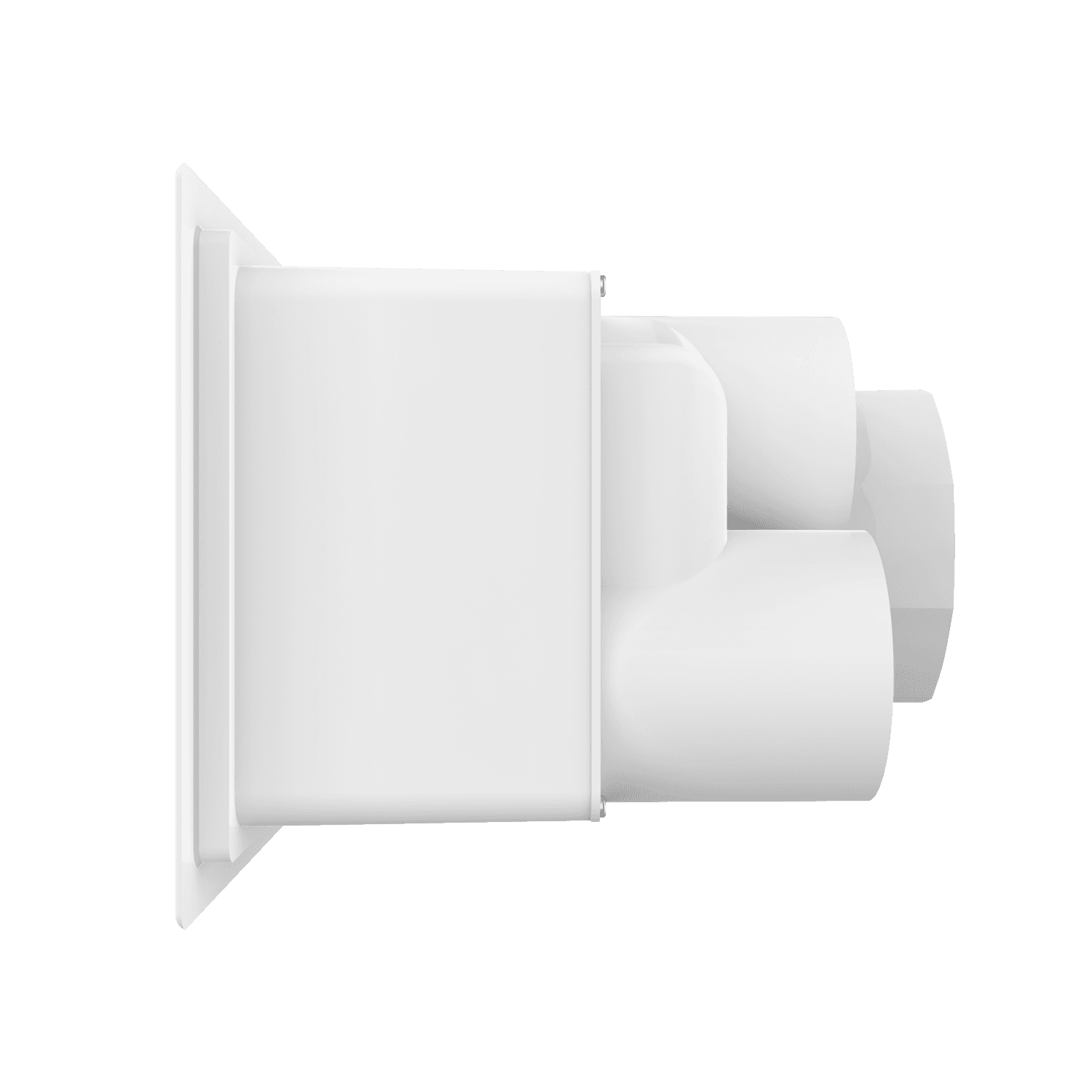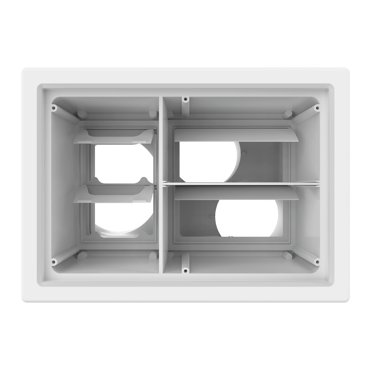 Triple exhaust box with dual 4″ and single 6″ duct ports in a horizontal orientation. 6″ port is located on the left side when viewing the box from the front. For use with precast concrete, aluminum panel and similar exteriors. Includes gravity backdraft dampers, mounting straps and separator fins which prevent exhaust from mingling inside the box. Can be customized to fit unique field conditions.