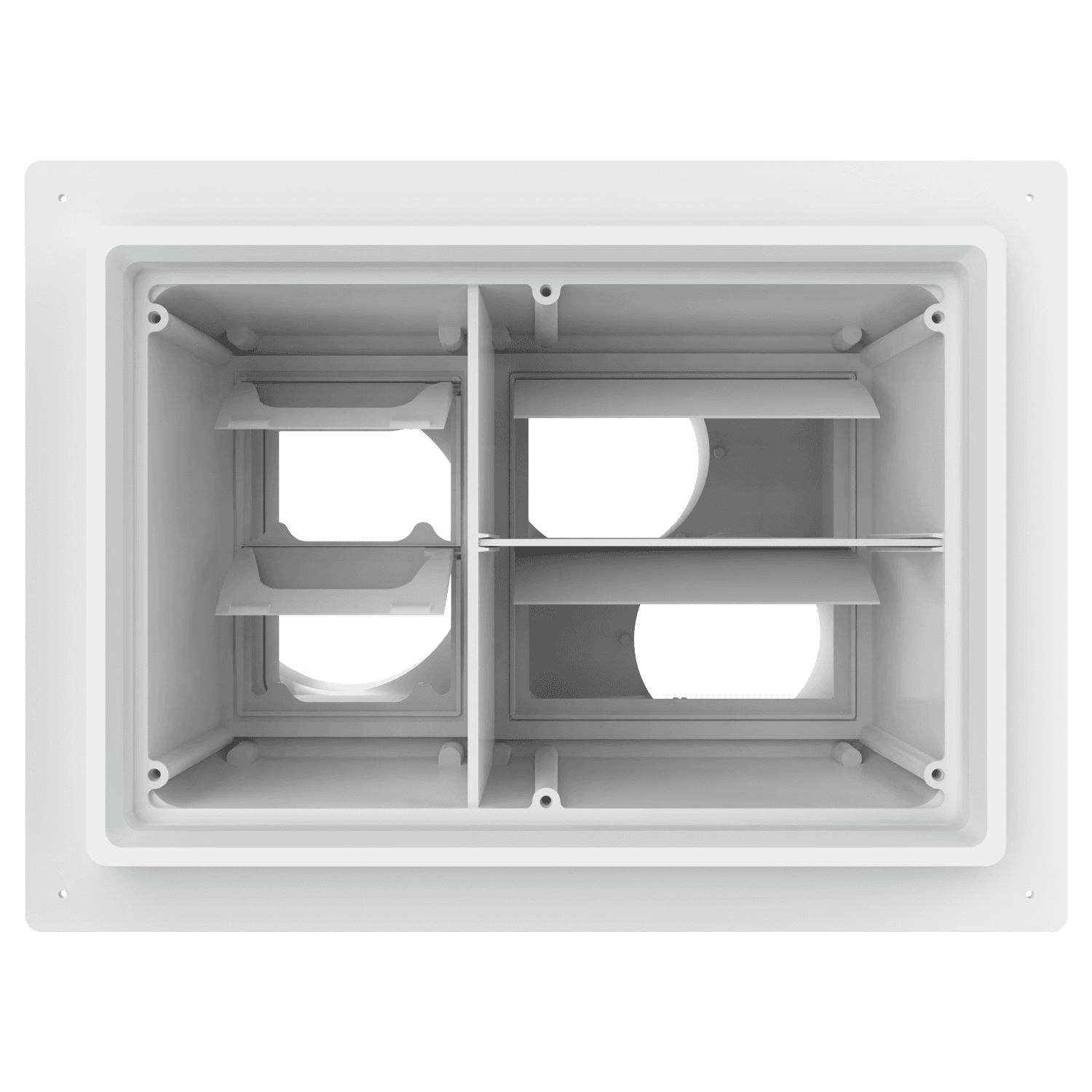 Triple exhaust box with dual 4″ and single 6″ duct ports in a horizontal orientation. 6″ port is located on the left side when viewing the box from the front. For use with stucco/siding and similar exteriors less than 7/8″ thick. Includes gravity backdraft dampers and separator fins which prevent exhaust from mingling inside the box. Can be customized to fit unique field conditions.