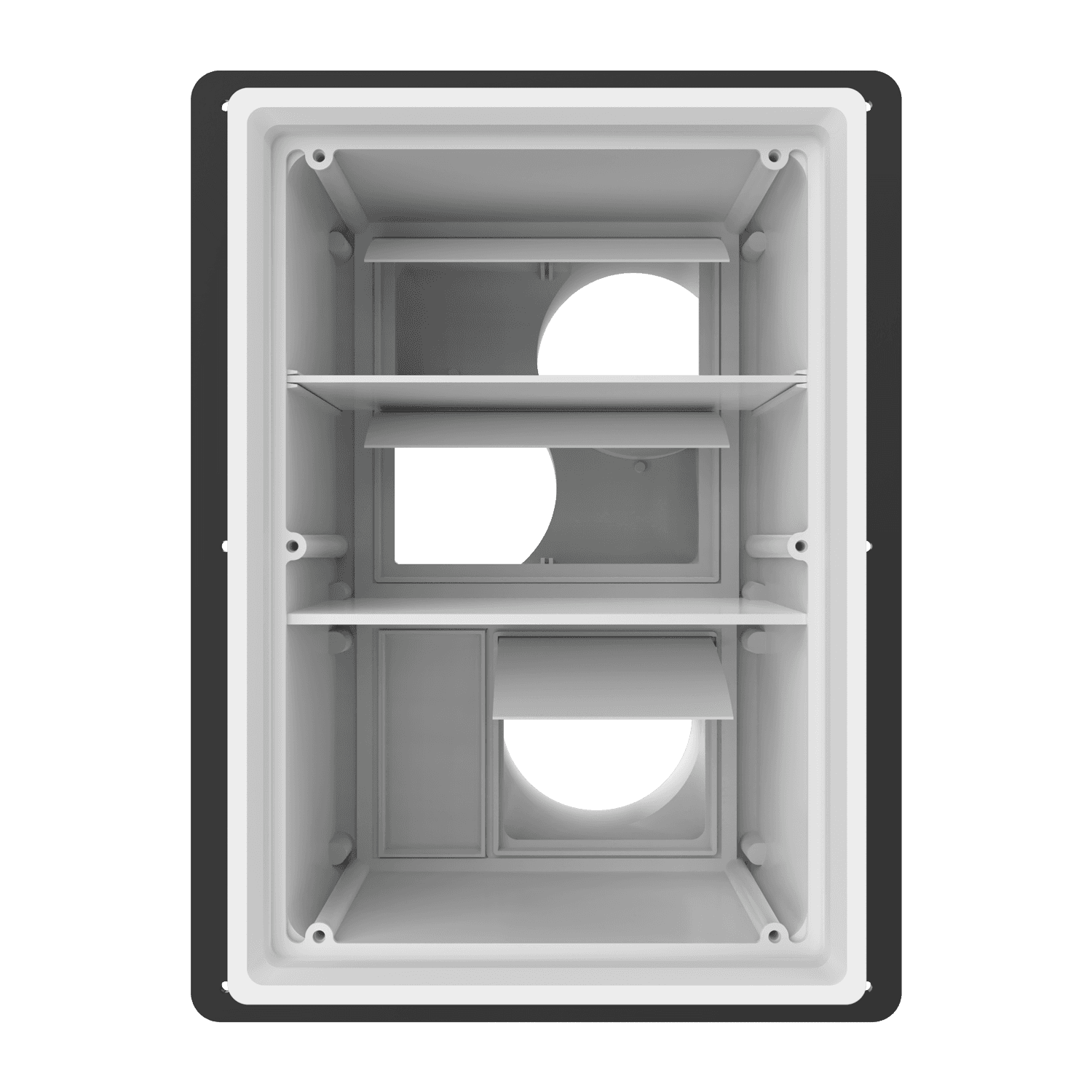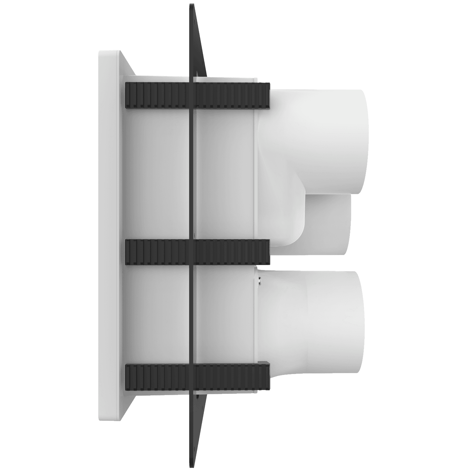 Triple exhaust box with three 4″ duct ports in a vertical orientation. For use with brick/stone, EIFS, metal panel, stucco/siding greater than 7/8″ thick and similar exteriors. Includes adjustable mounting flange with an offset range of 1″-6″, gravity backdraft dampers and separator fins which prevent exhaust from mingling inside the box. Can be customized to fit unique field conditions.