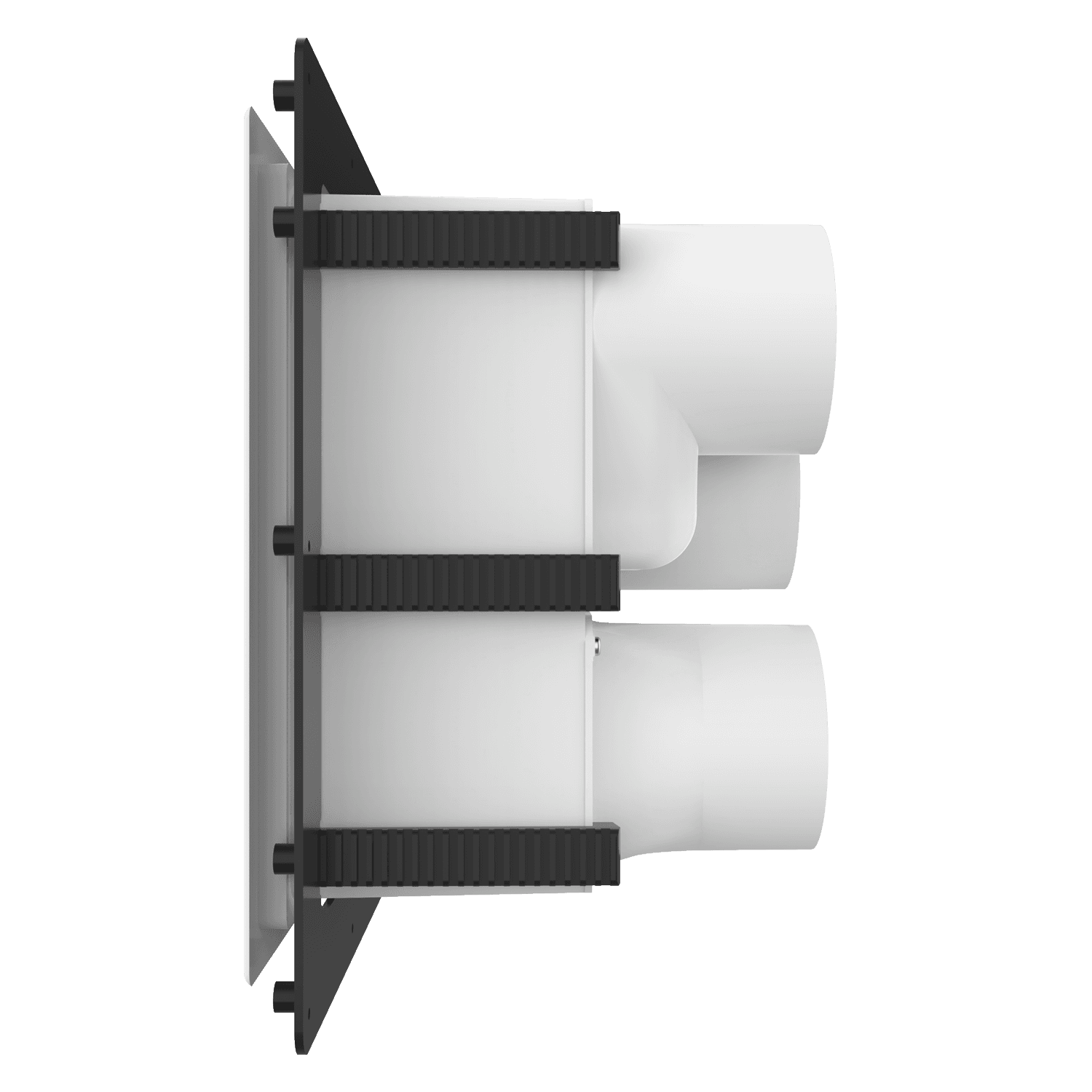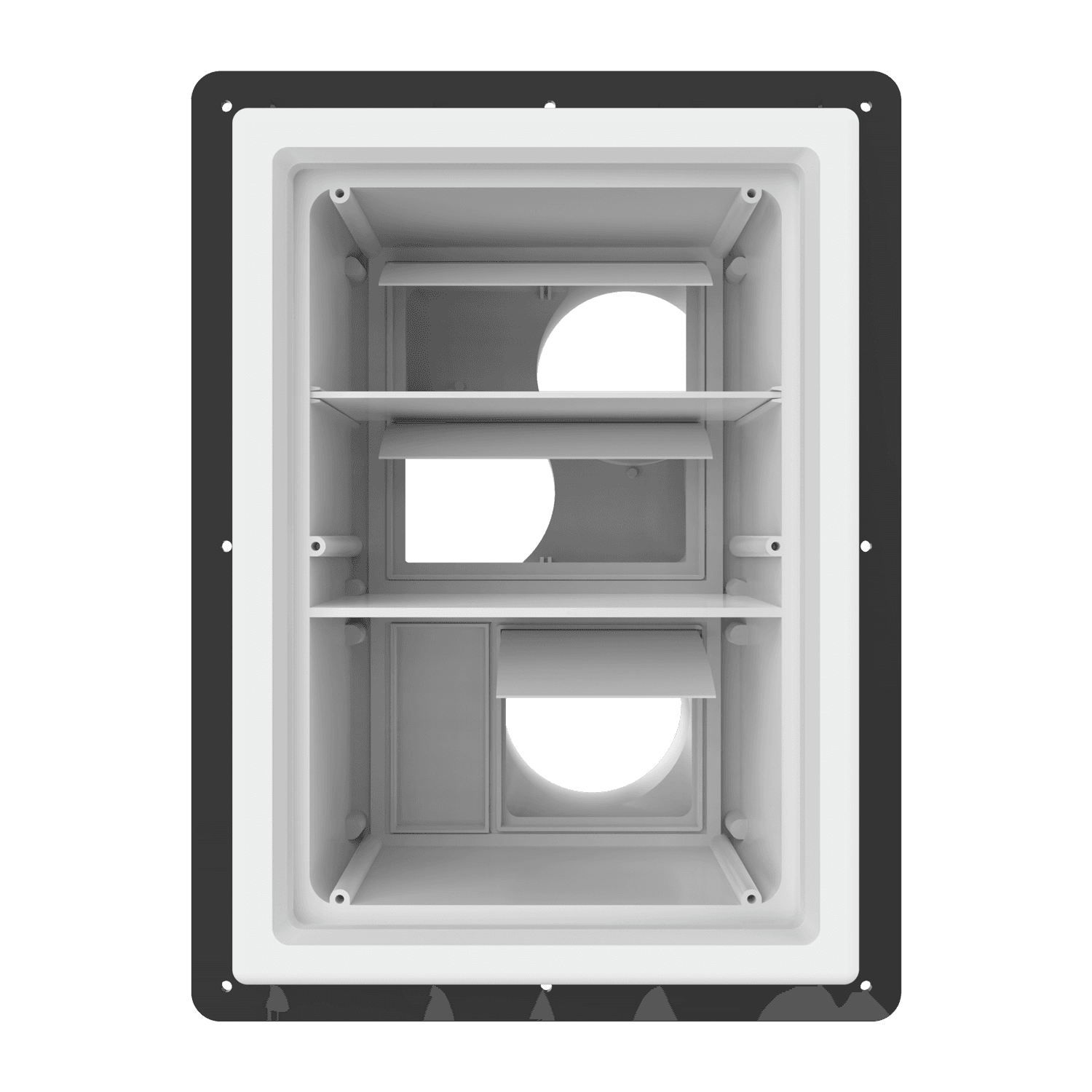 Triple exhaust box with three 4″ duct ports in a vertical orientation. For use with glass curtain wall, glazing/composite panel systems and similar exteriors. Includes compression plate mounting flange, gravity backdraft dampers and separator fins which prevent exhaust from mingling inside the box. Can be customized to fit unique field conditions.