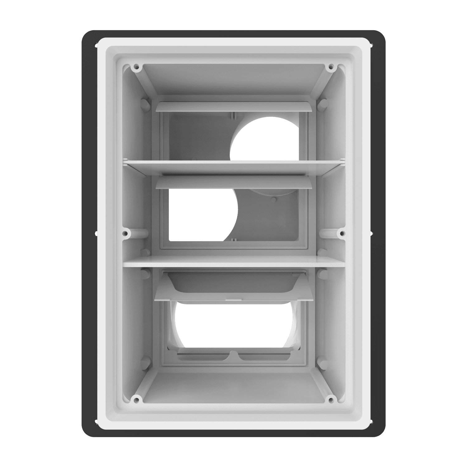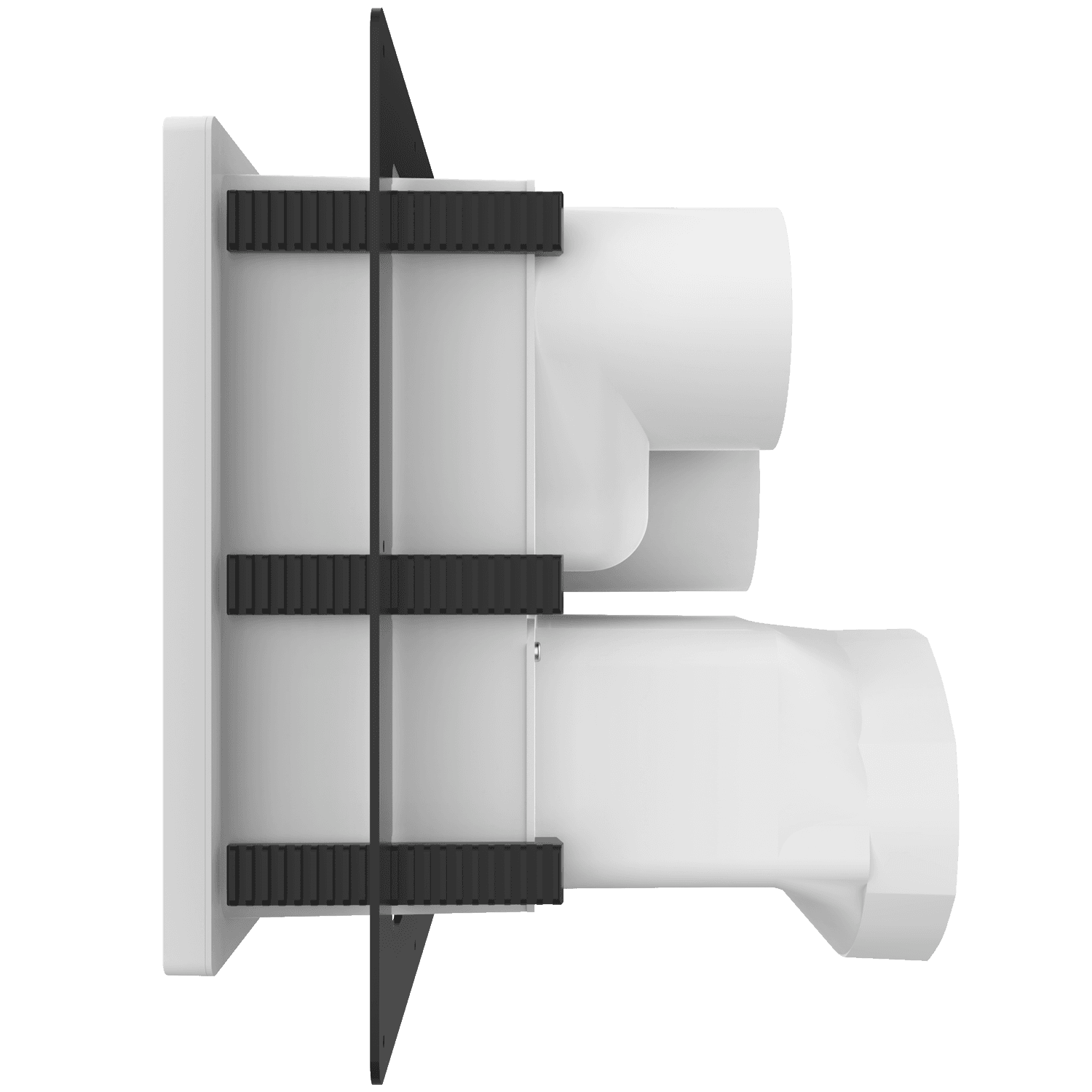 Triple exhaust box with dual 4″ and single 6″ duct ports in a vertical orientation. 6″ port is located at the bottom of the box. For use with brick/stone, EIFS, metal panel, stucco/siding greater than 7/8″ thick and similar exteriors. Includes adjustable mounting flange with an offset range of 1″-6″, gravity backdraft dampers and separator fins which prevent exhaust from mingling inside the box. Can be customized to fit unique field conditions.