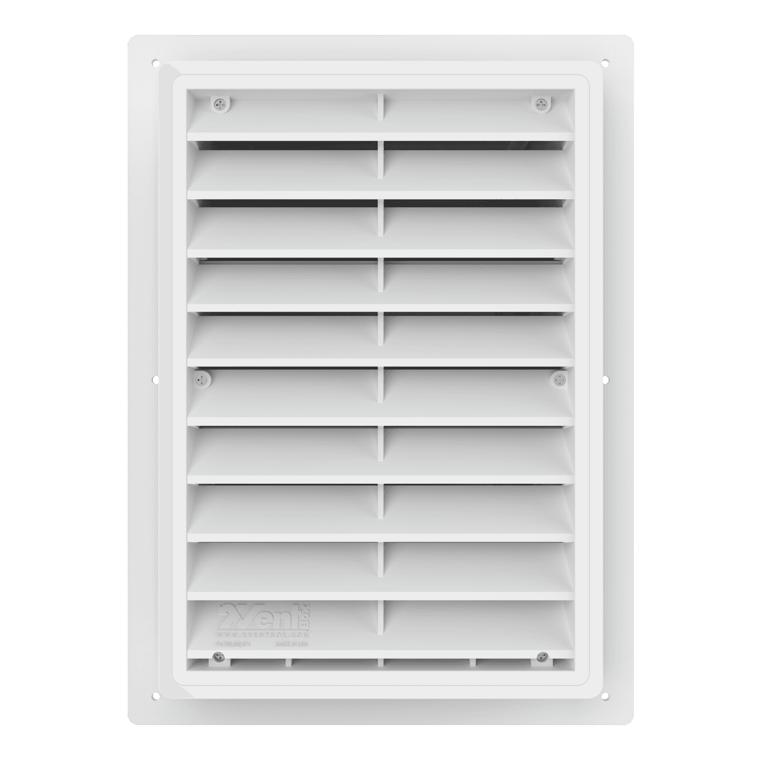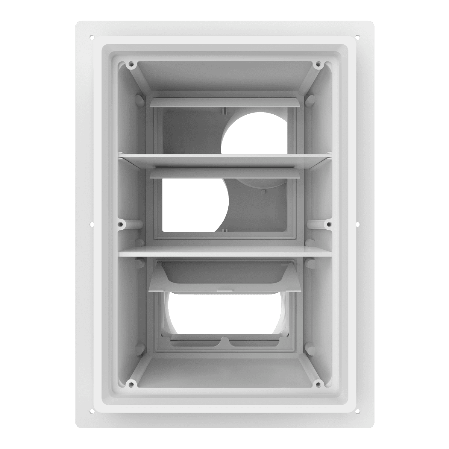 Triple exhaust box with dual 4" and single 6" duct ports in a vertical orientation. 6" port is located at the bottom of the box. For use with brick/stone, EIFS, metal panel and stucco/siding greater than 7/8" thick and similar exteriors. New adjustable mounting sleeve extends offset range from 1"-9". Includes an improved weather seal, gravity backdraft dampers and separator fins which prevent exhaust from mingling inside the box. Can be customized to fit unique field conditions.
