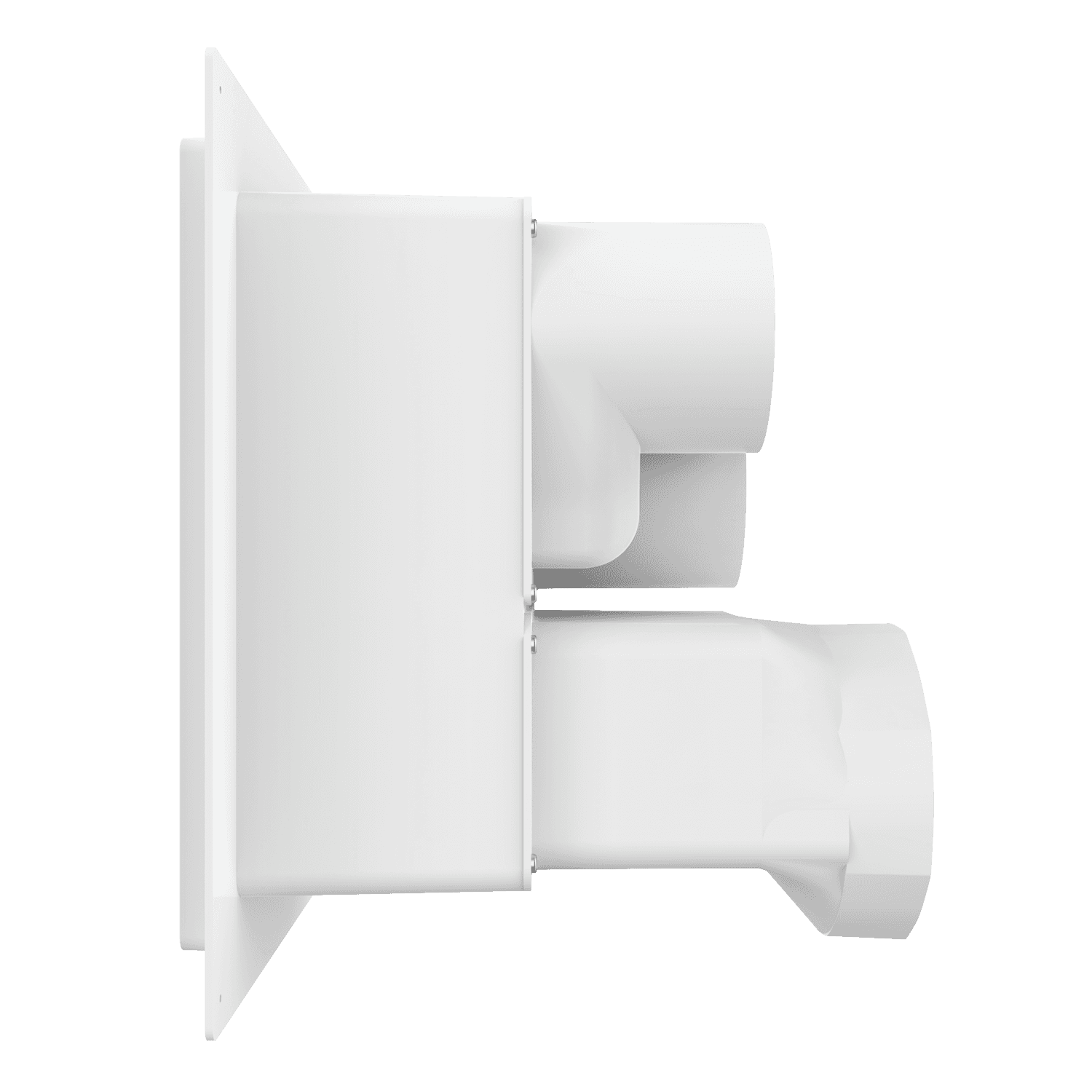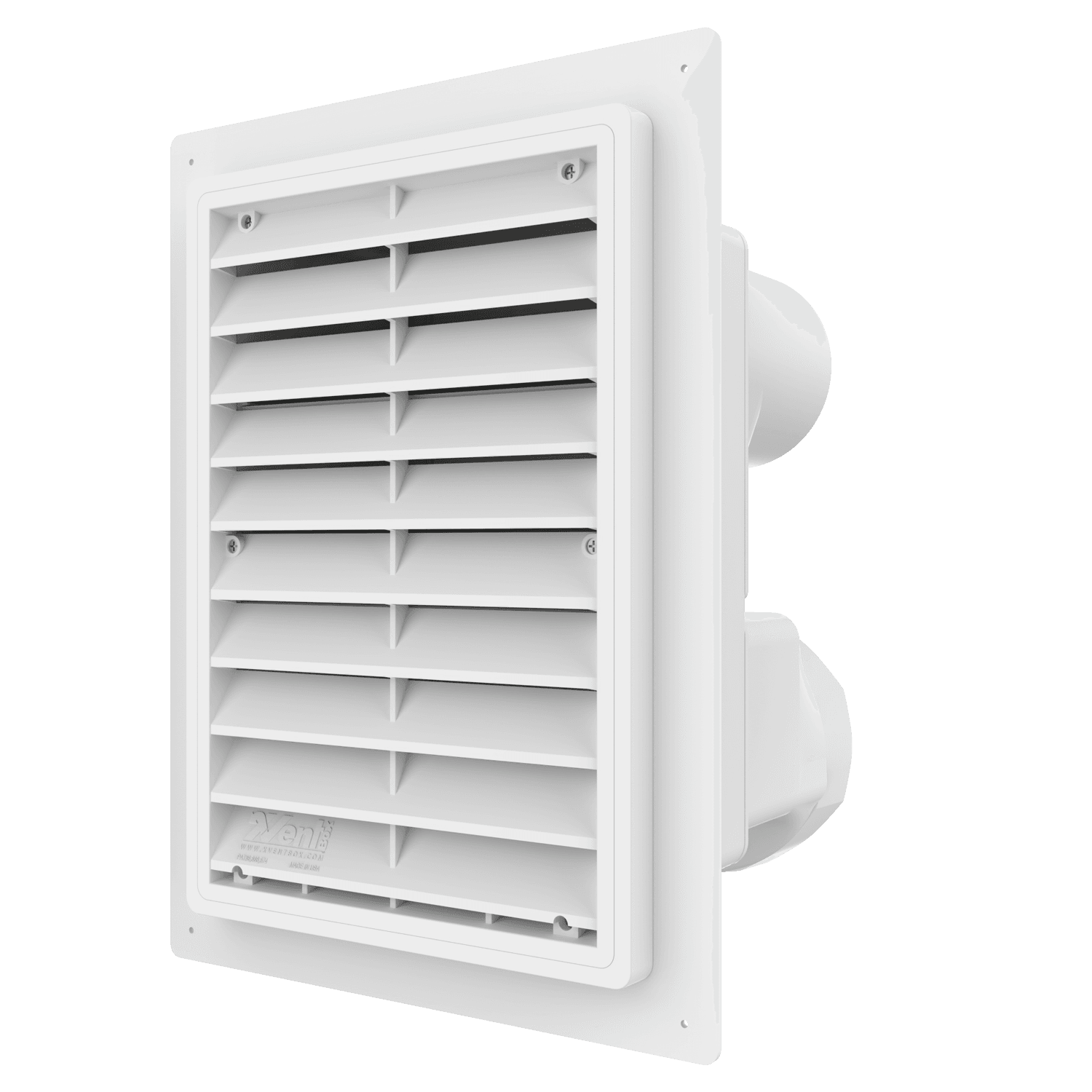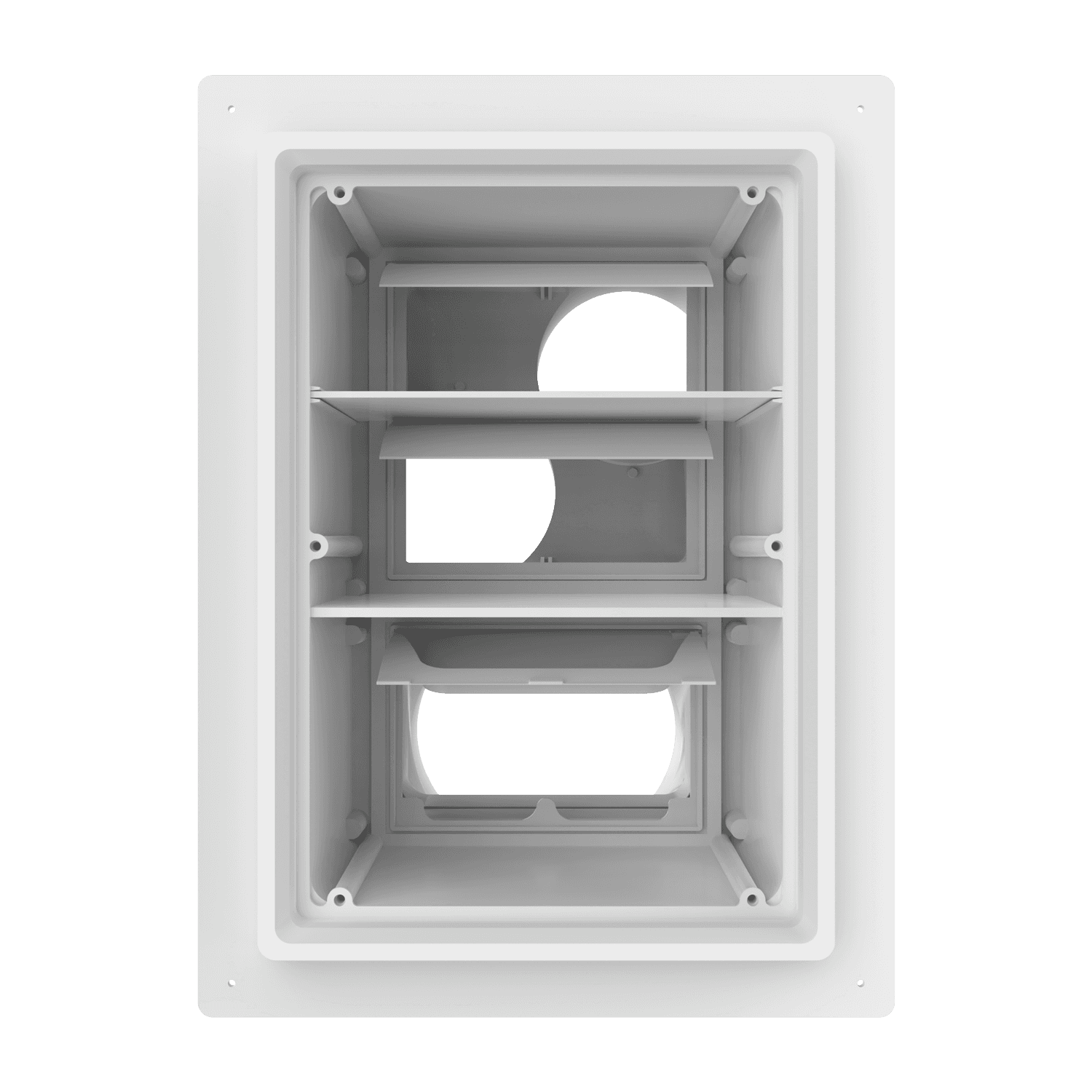 Triple exhaust box with dual 4″ and single 6″ duct ports in a vertical orientation. 6″ port is located at the bottom of the box. For use with stucco/siding and similar exteriors less than 7/8″ thick. Includes gravity backdraft dampers and separator fins which prevent exhaust from mingling inside the box. Can be customized to fit unique field conditions.
